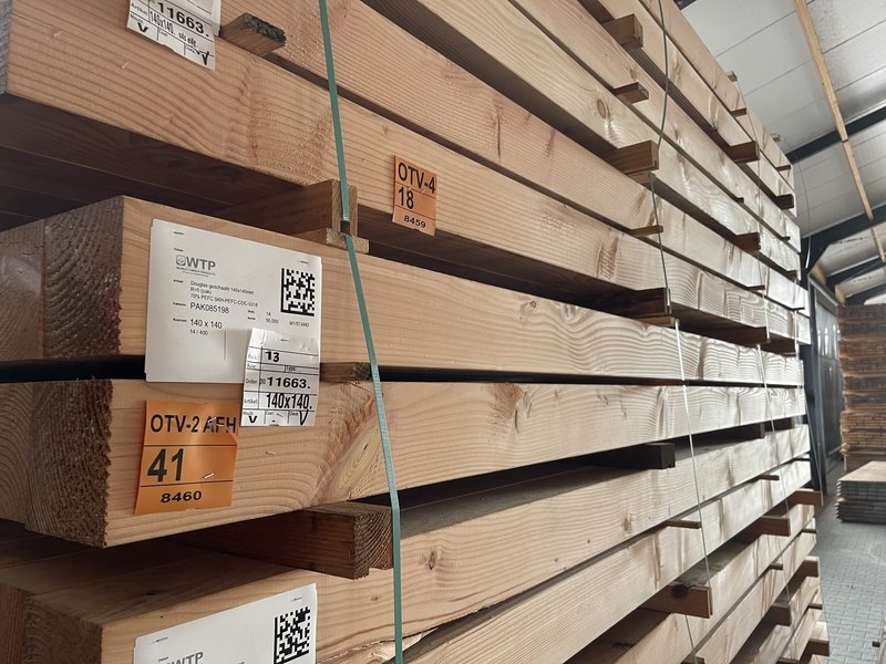 Product: Douglas Balken Geschaafd Materiaal: Douglas Afmeting: 140x140mm, lengte 400cm Conditie: nieuw