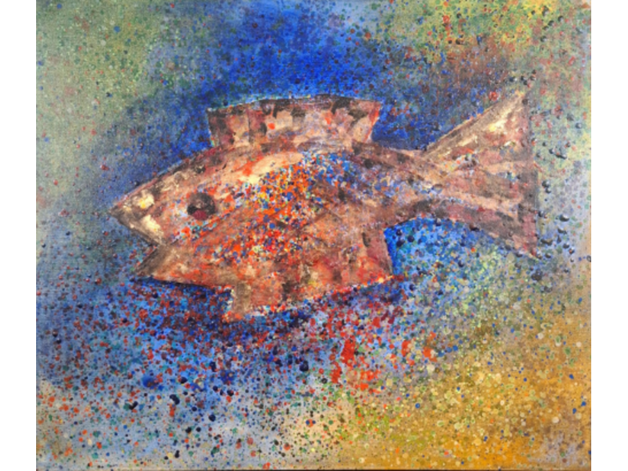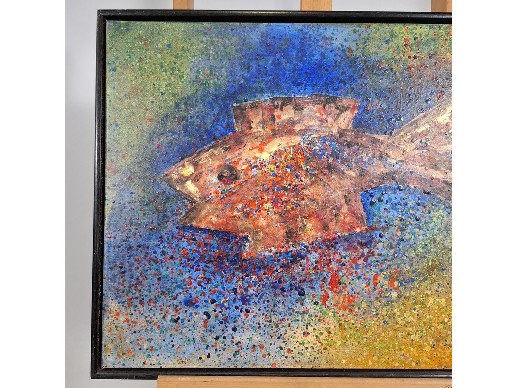 Acryl schilderij, maya wildevuur, vis, 1994