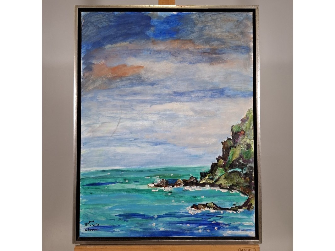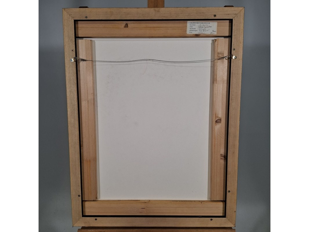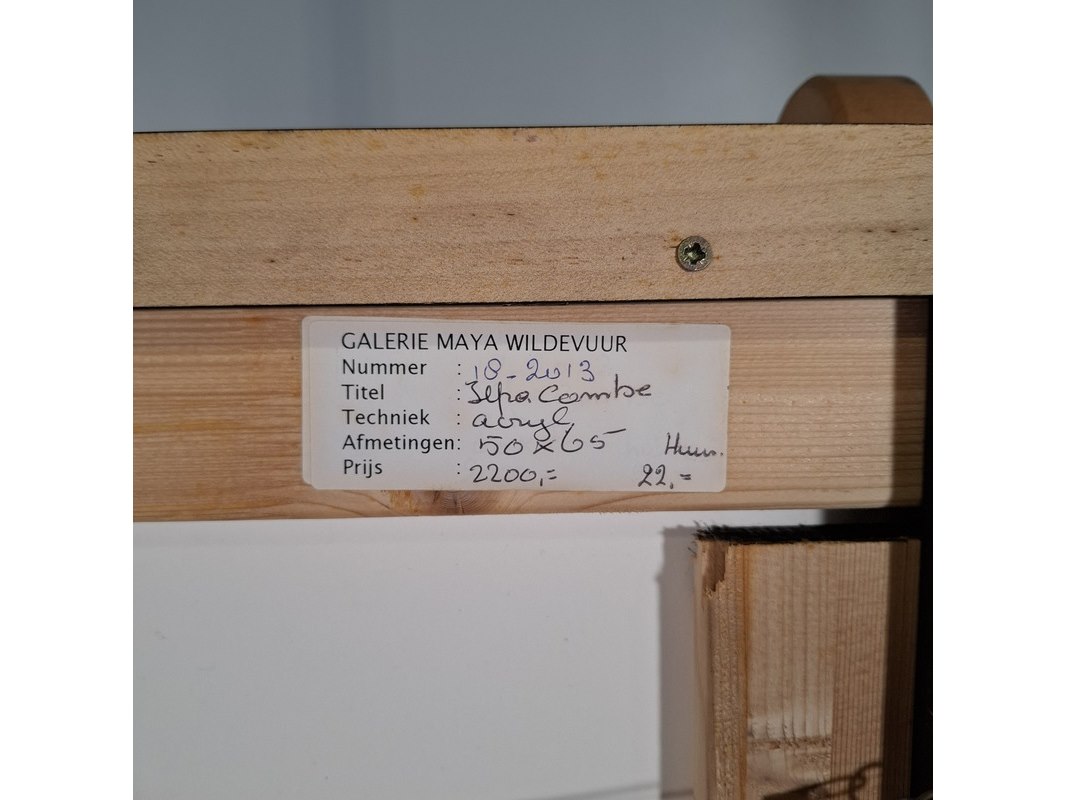 Merk: Maya Wildevuur Product: Acryl schilderij Afmeting: Hxb ca. 68x53 cm BouwJaar: 2012 Specificaties: Werk en lijst hebben diverse beschadigingen.
