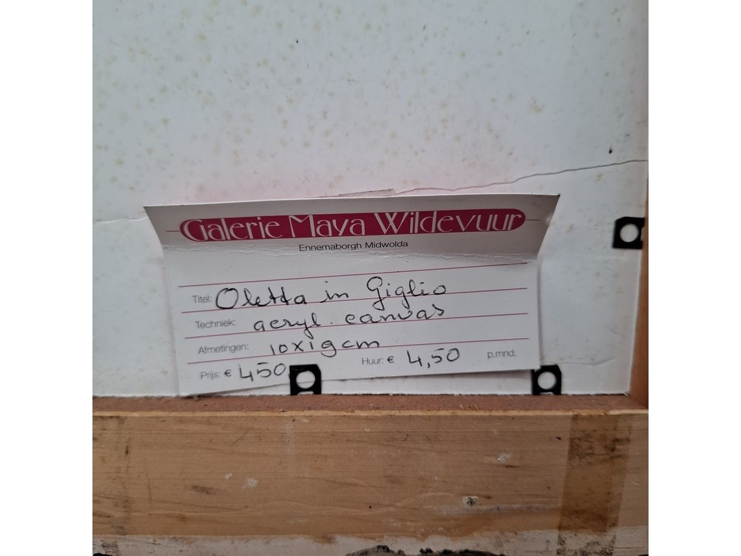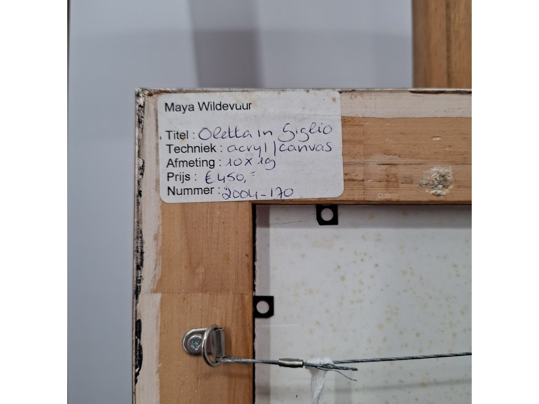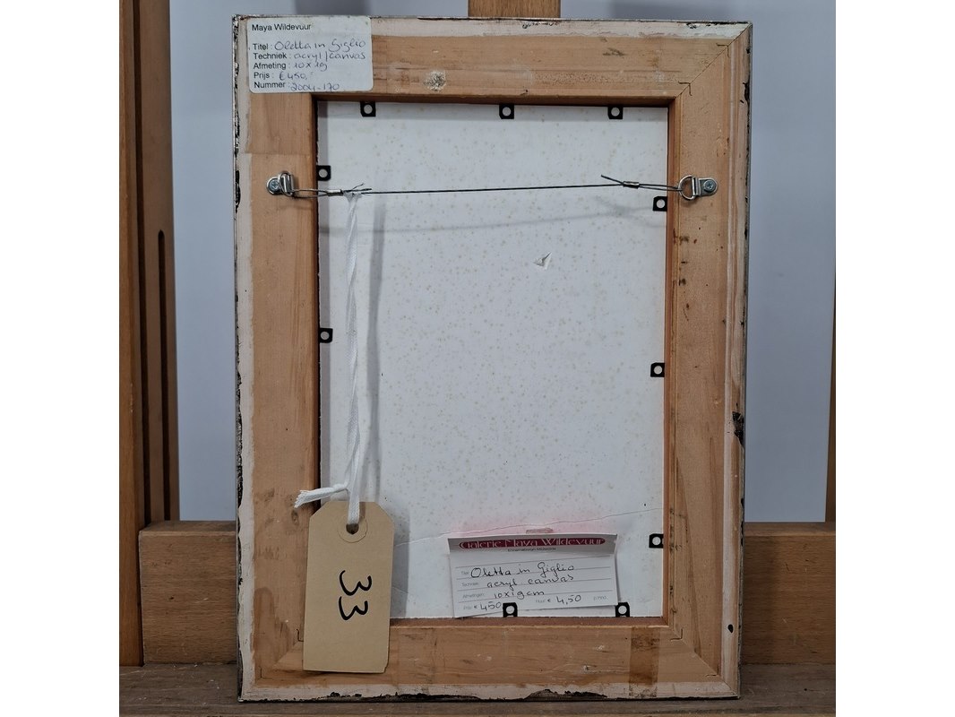 Merk: Maya Wildevuur Product: Acryl schilderij op canvas Afmeting: HxB ca. 36x27 cm. BouwJaar: 2004 Conditie: gebruikt