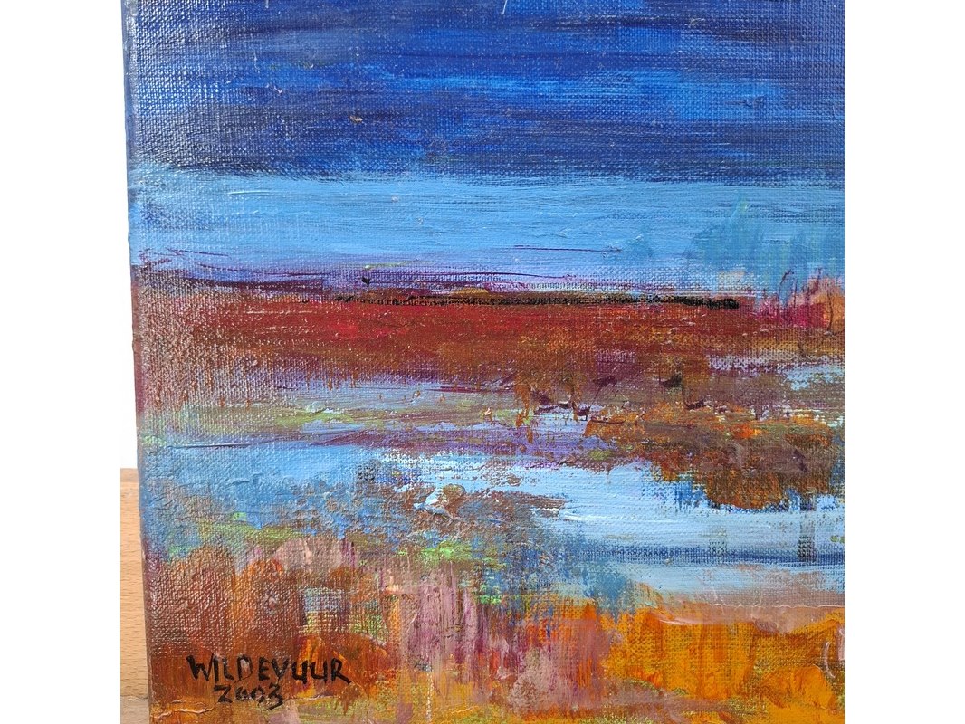 Merk: Maya Wildevuur Product: Acryl schilderij op doek Afmeting: HxB ca. 24x30 cm. BouwJaar: 2003 Conditie: gebruikt