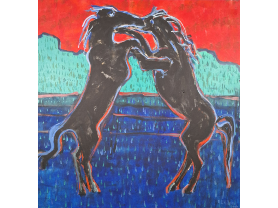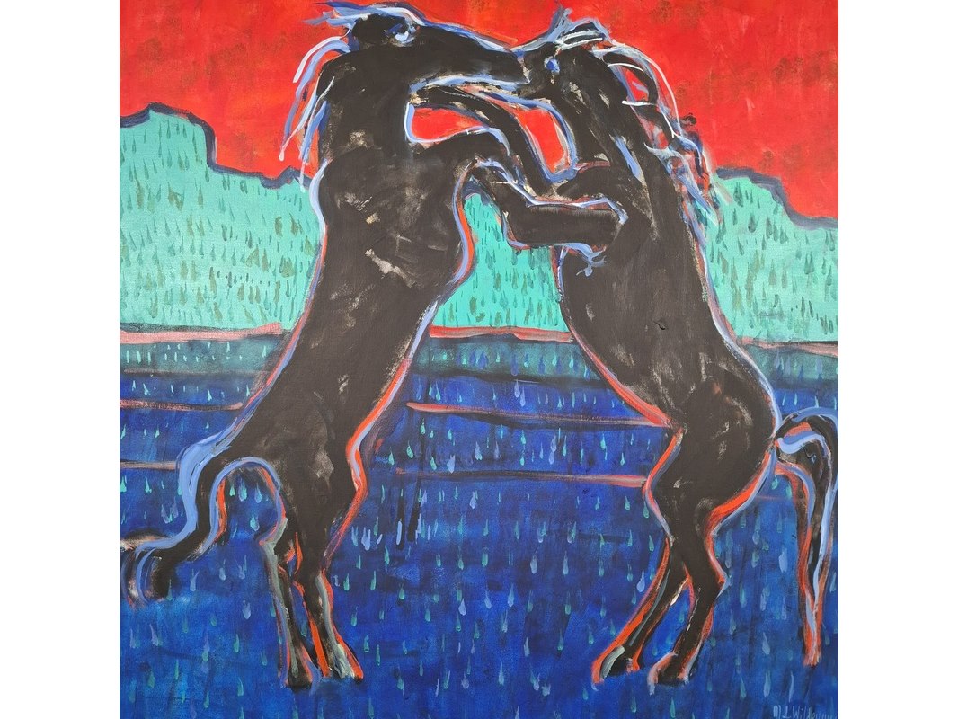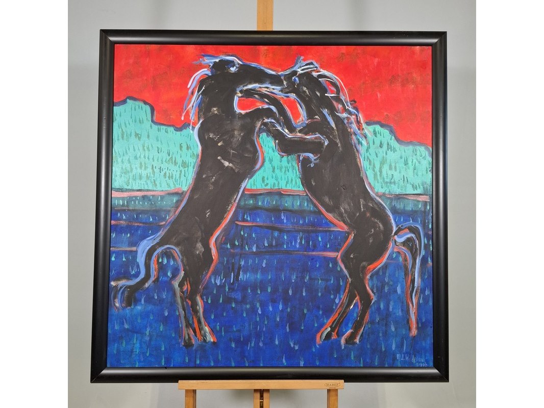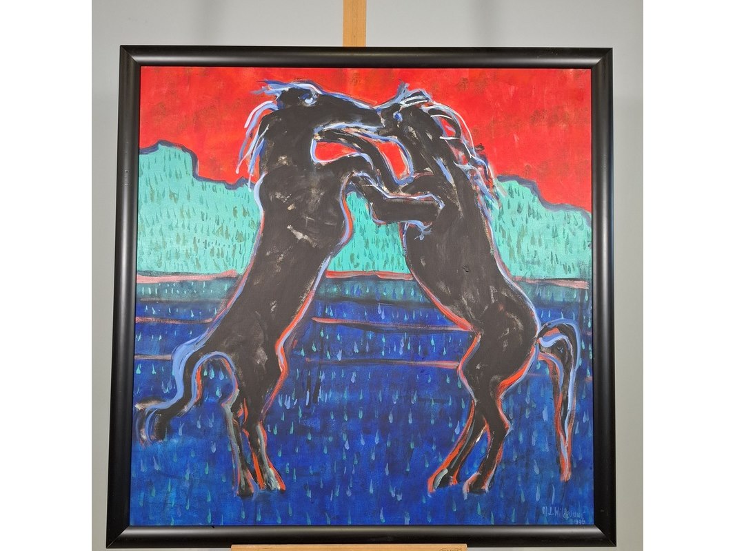 Acryl schilderij op doek, maya wildevuur, vechtende paarden, 1996