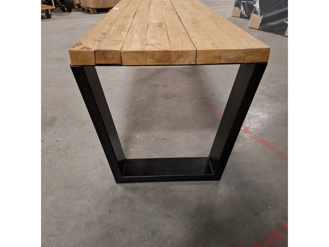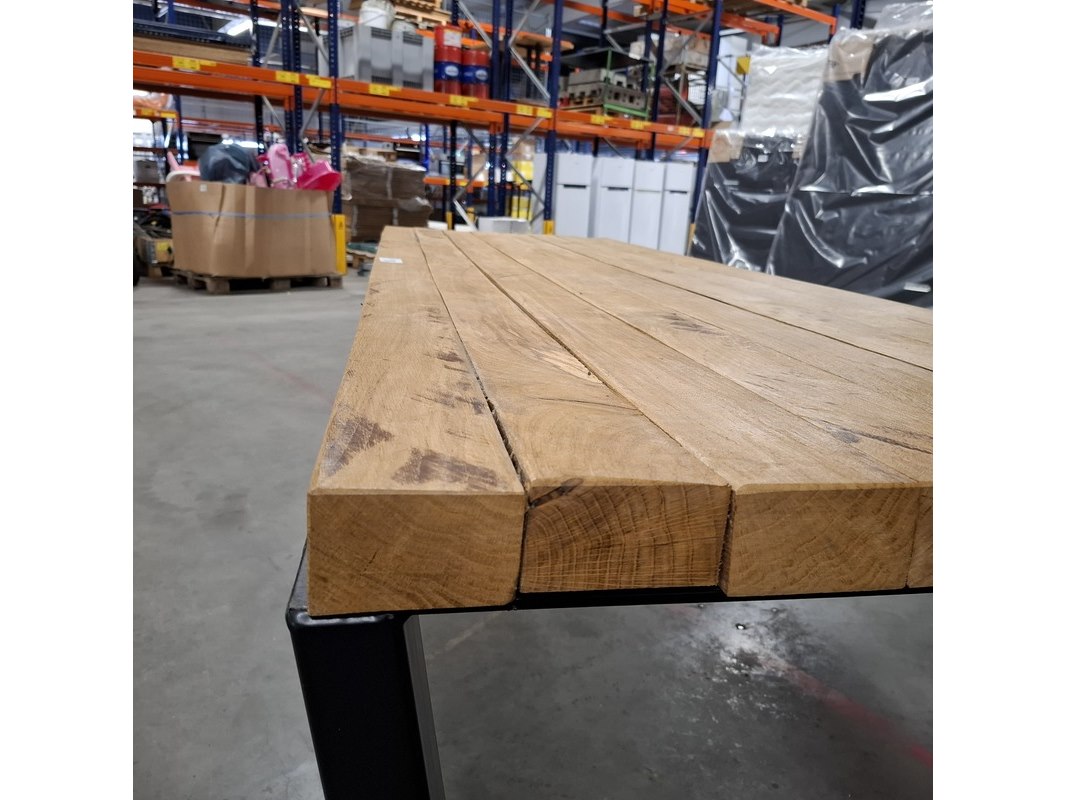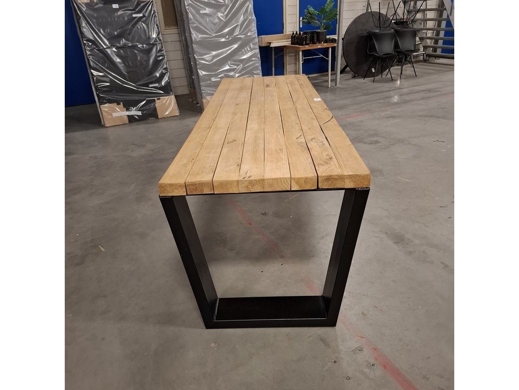 Merk: Wood Industries Product: Massief eiken eetkamertafel Kleur: Bruin Materiaal: Massief eiken Afmeting: LxBxH ca. 240x78x76cm Conditie: Gebruikt Specificaties: Massief houten tafel voorzien van zwart stalen poten.