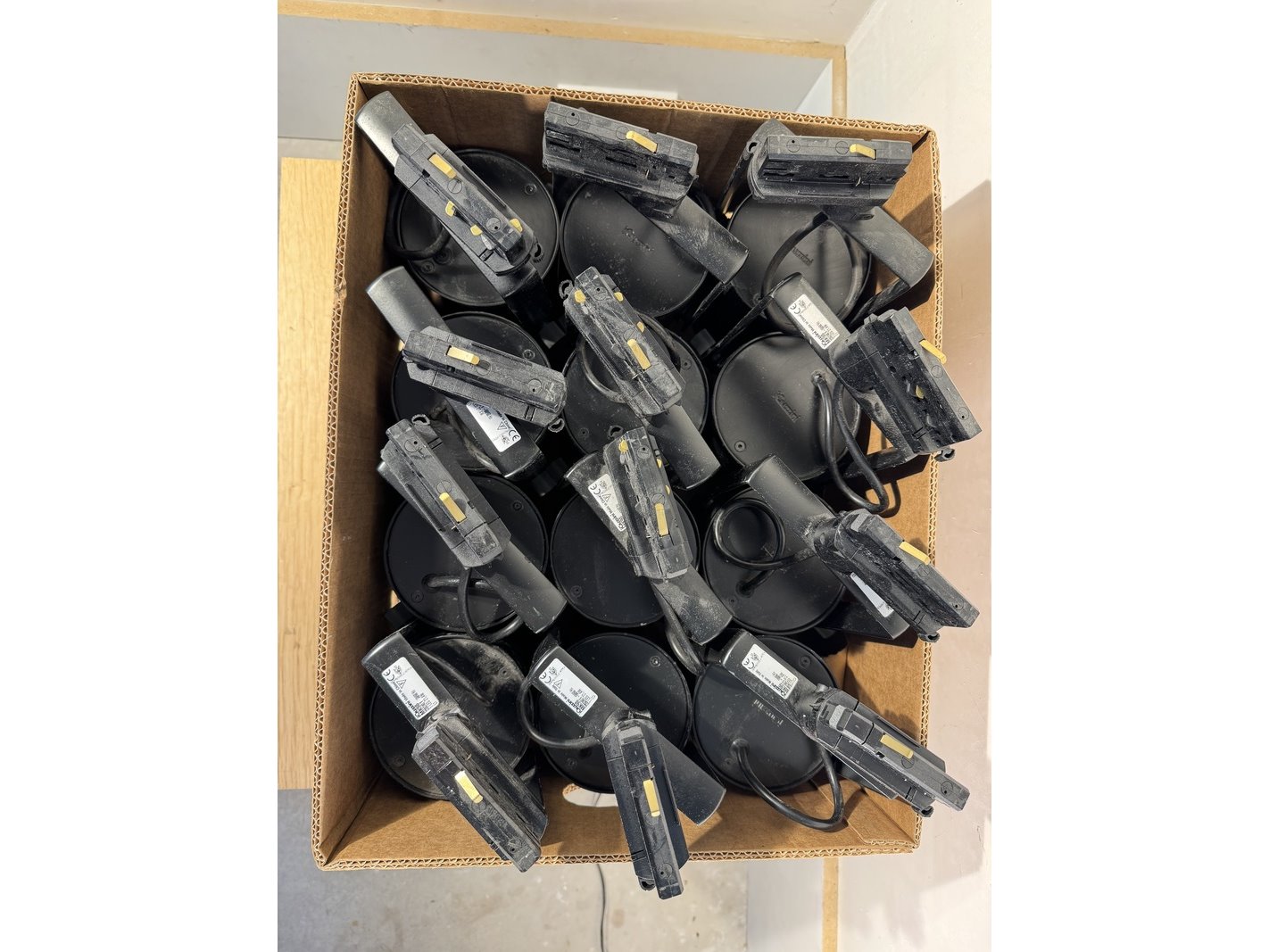 Merk: Iguzzini Product: Led Verlichting spot Kleur: Zwart Materiaal: Aluminium Afmeting: 11,5x15,5cm (øxL) Conditie: Gebruikt Specificaties: 20xIguzzini Led verlichting spot, simpel op rails te klikken of aan te sluiten op 220v.