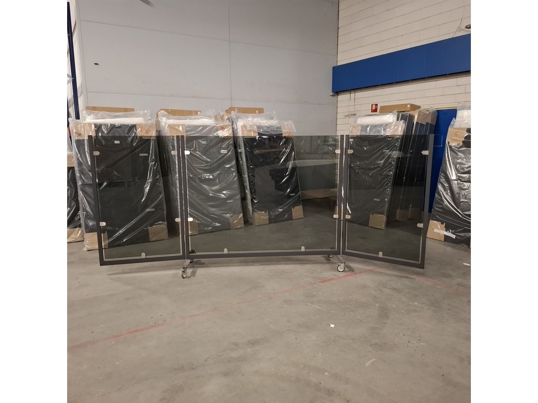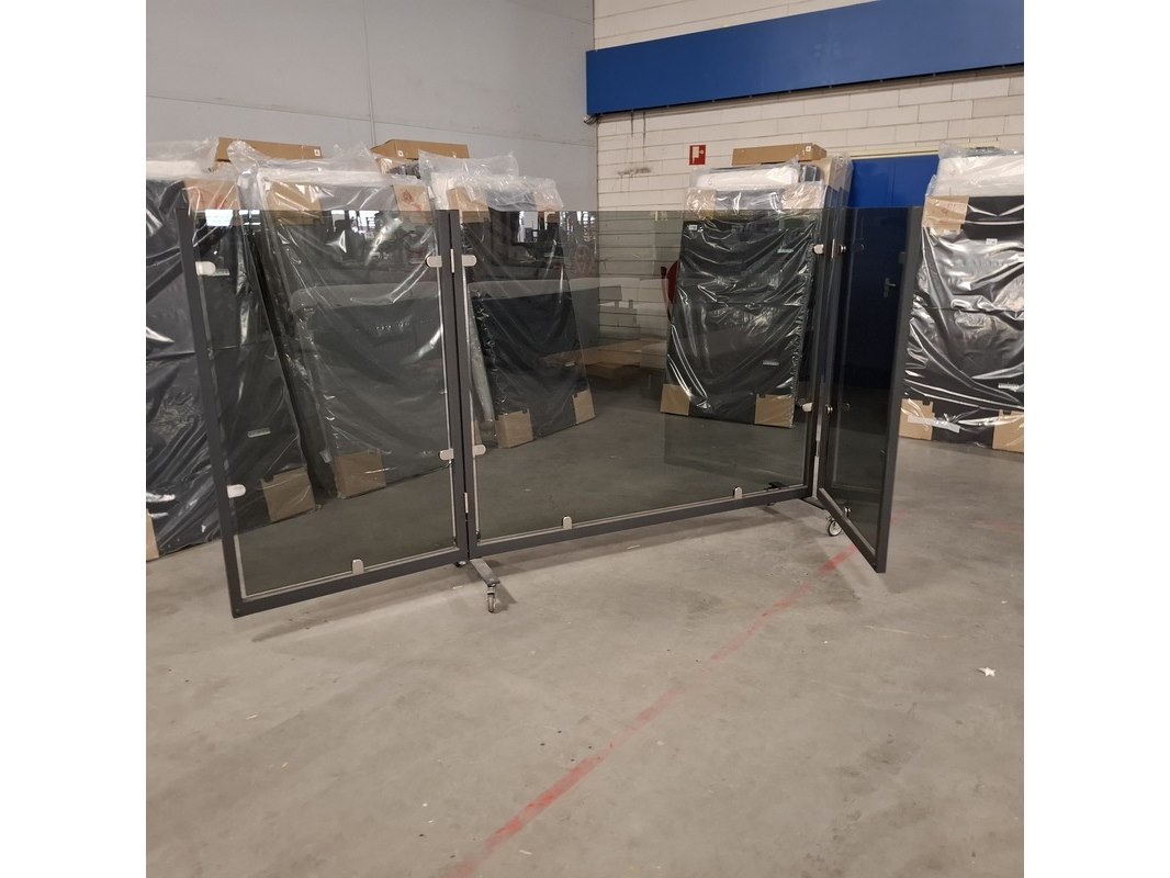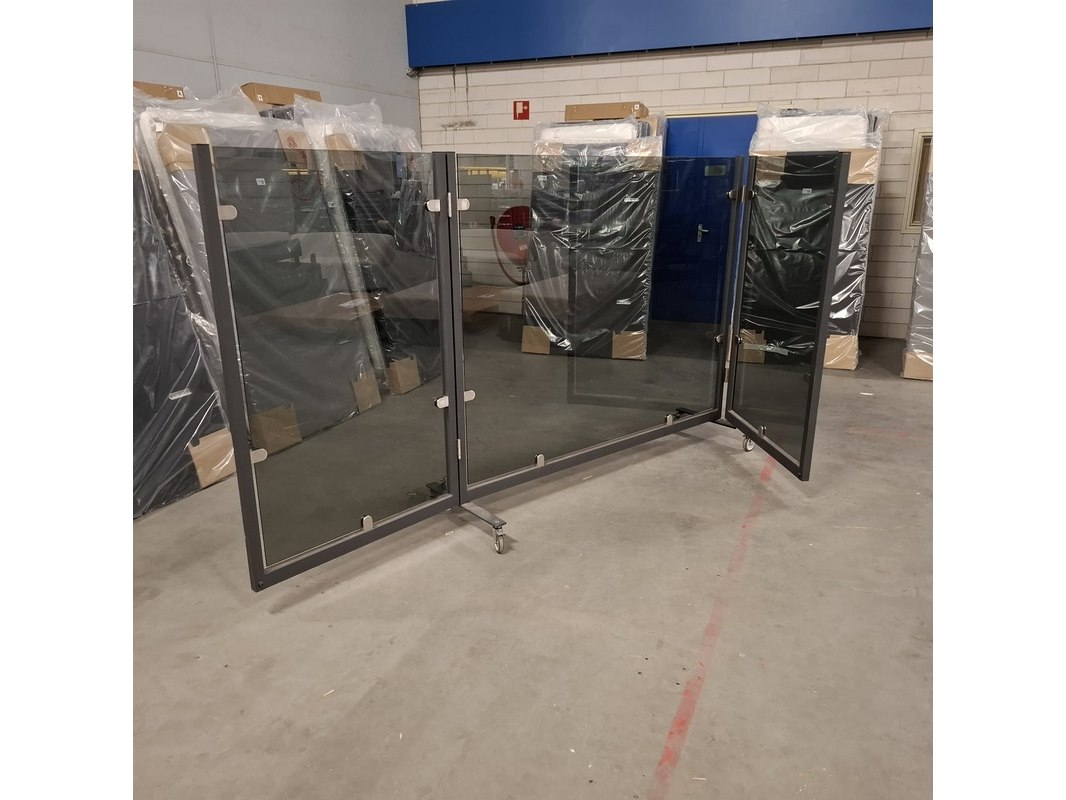 Product: Terrasscheidingswand (uitklapbaar) Materiaal: Aluminium/glas Afmeting: Lxb ca. 400x169cm Conditie: Gebruikt Specificaties: Inclusief extra wielen