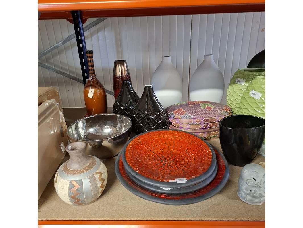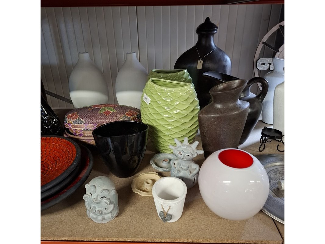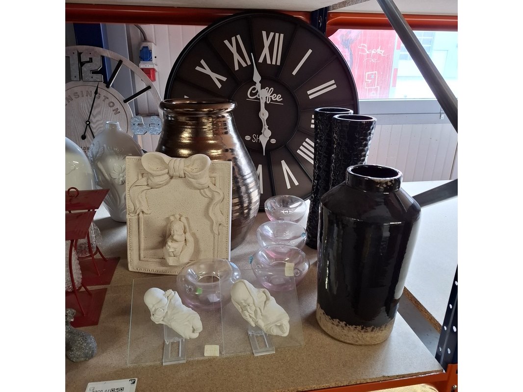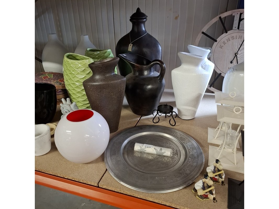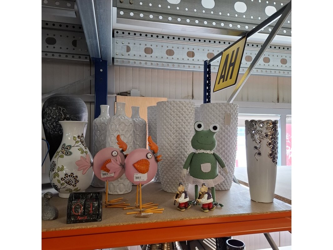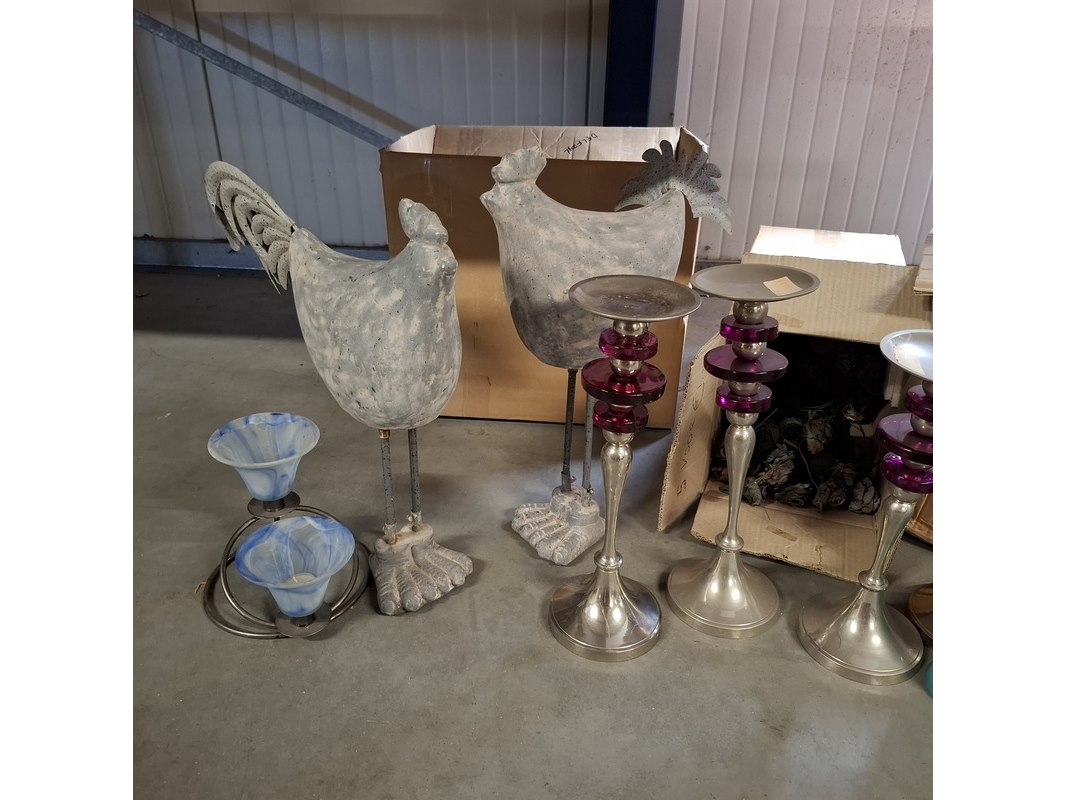 Product: Partij woondecoratie Conditie: Nieuw Specificaties: Magazijnopruiming enkele stuks kunnen lichte beschadigingen hebben. partij van ca 200 stuks woondecoratie ca 50 stuks miniroosjes ca 10 schalen ca 15 waxinehouders / sfeerlichten ca 70 diversen , waarvan veel grote vazen ca 20 dieren beelden 6x glas schilderij