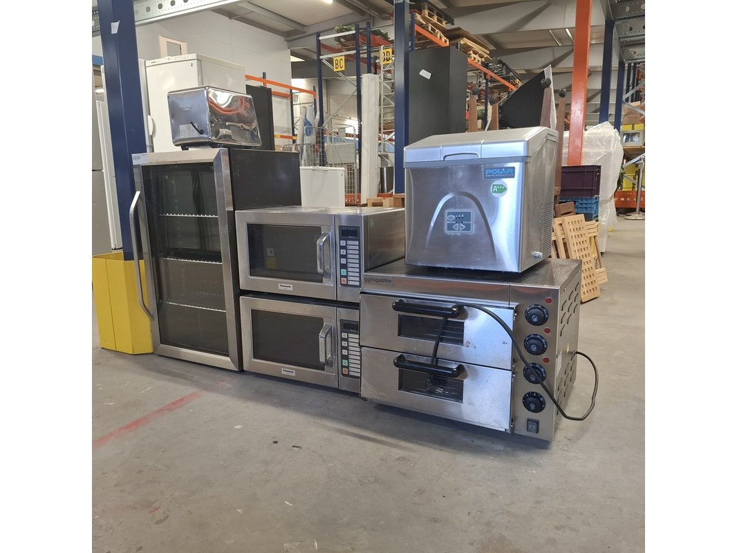 Merk: o.a. GGM Gastro, Panasonic, Polar Product: Horeca apparaten Conditie: Gebruikt Specificaties: Bestaande uit: 2x magnetron Panasonic NE-1037 1x ijsblokjes machine Polar G 620 1x dubbele pizzaoven GGM Gastro PDKG20 1x tosti apparat Caterchef MT-C2P 1x wijnkoeler Klarstein item-nr 10027673
