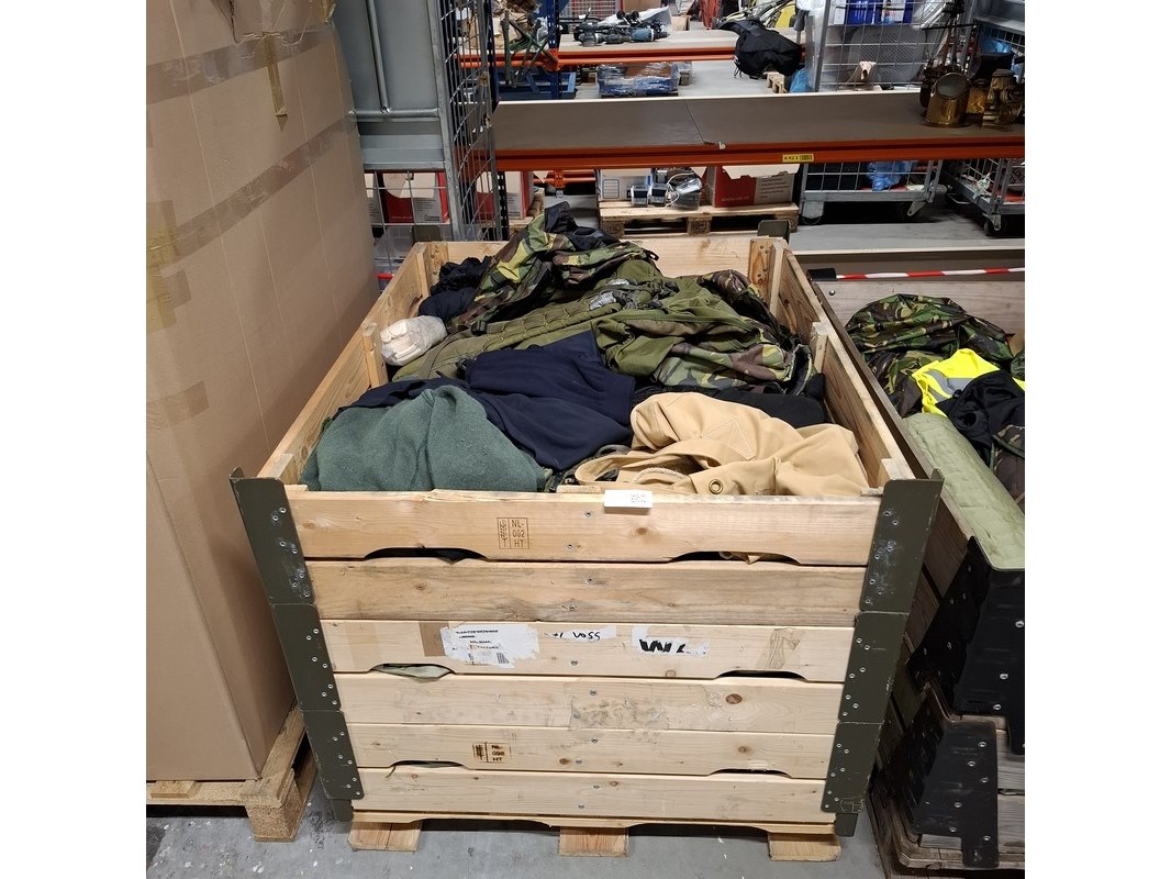 Merk: KPU / KL / Woodland Product: Persoonlijke uitrusting en kleding defensie Conditie: Gebruikt Specificaties: Diverse soorten en maten Inclusief palletkist