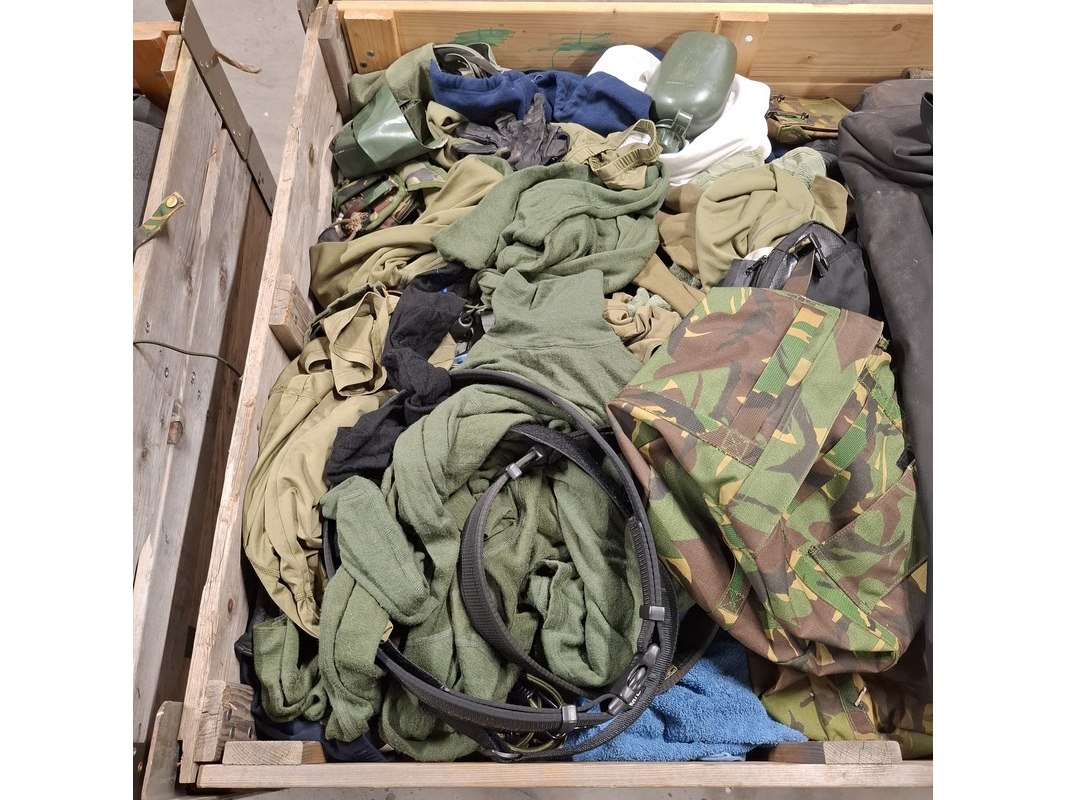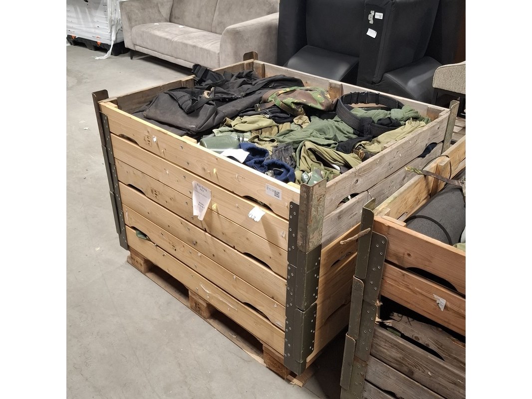Merk: Woodland, KPU, KL Product: Persoonlijke uitrusting en kleding defensie Conditie: Gebruikt Specificaties: Inclusief houten pallet krat.