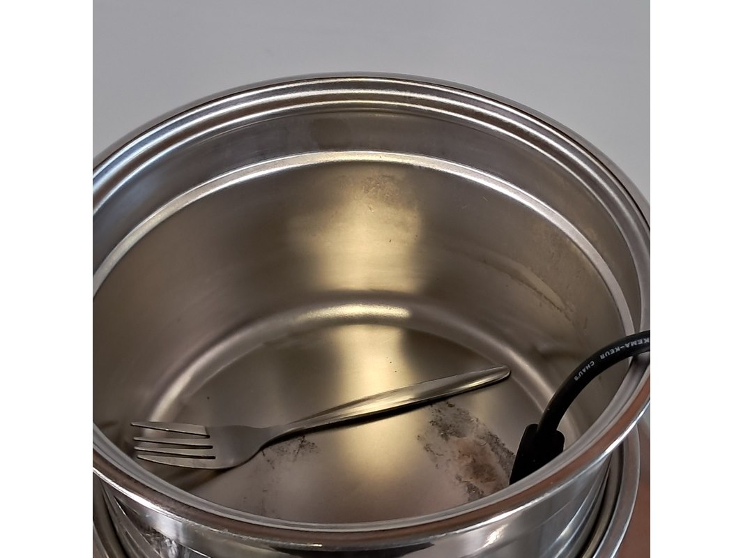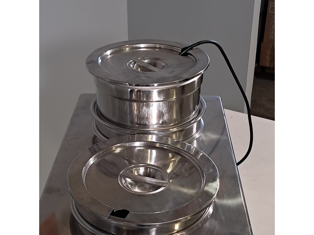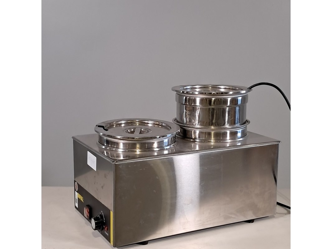 Merk: Buffalo Product: Bain marie met 2 ronde potten Afmeting: hxbxd ca. 23x34x54 cm Conditie: gebruikt Specificaties: Technische staat, werking en compleetheid onbekend.