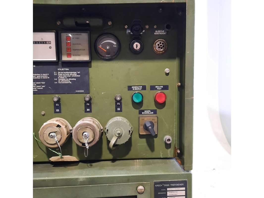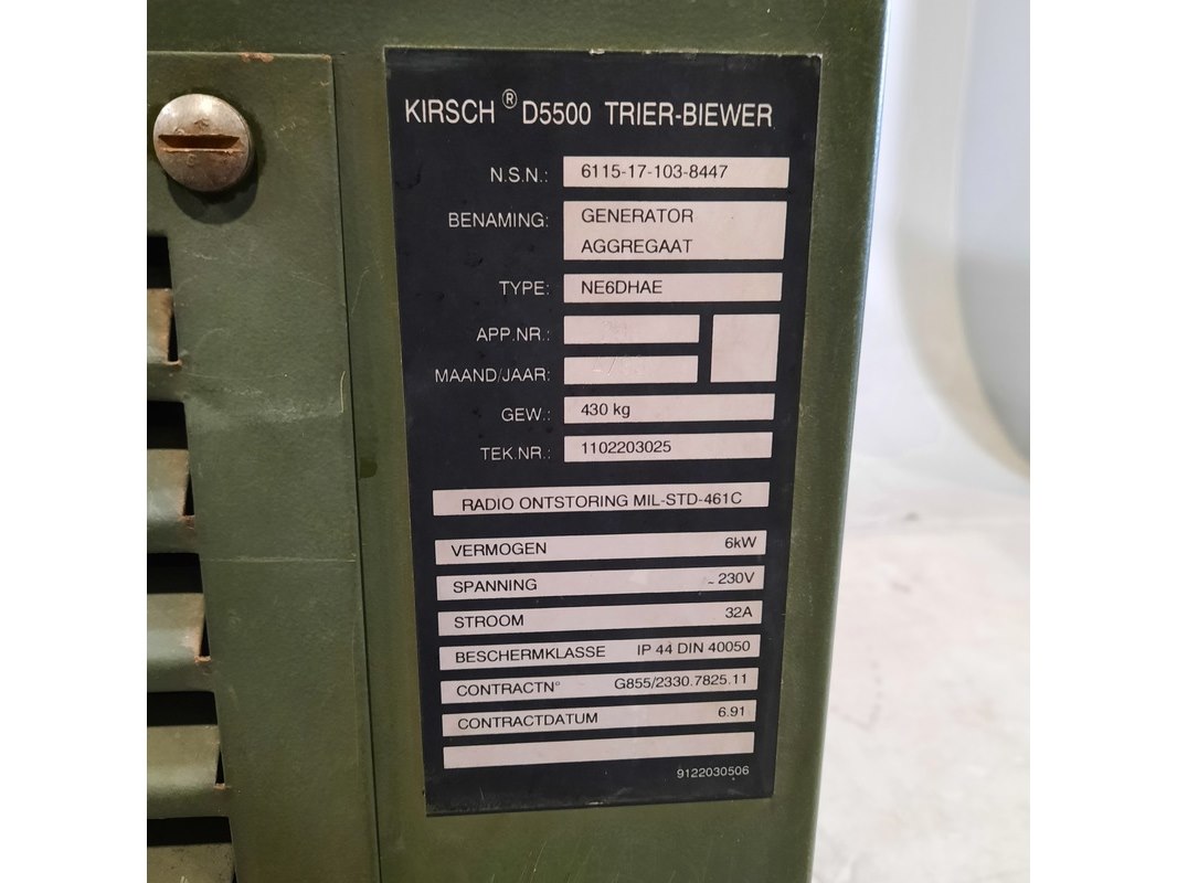 Merk: Kirsch Product: Aggregaat Afmeting: Lxbxh ca. 143x66x85 cm. BouwJaar: 1993 Conditie: Gebruikt Specificaties: Gewicht ca. 430 Kg. 6 kW 32A Afgelezen urenstand ca: 3714 Exclusief sleutel Technische staat en compleetheid onbekend.