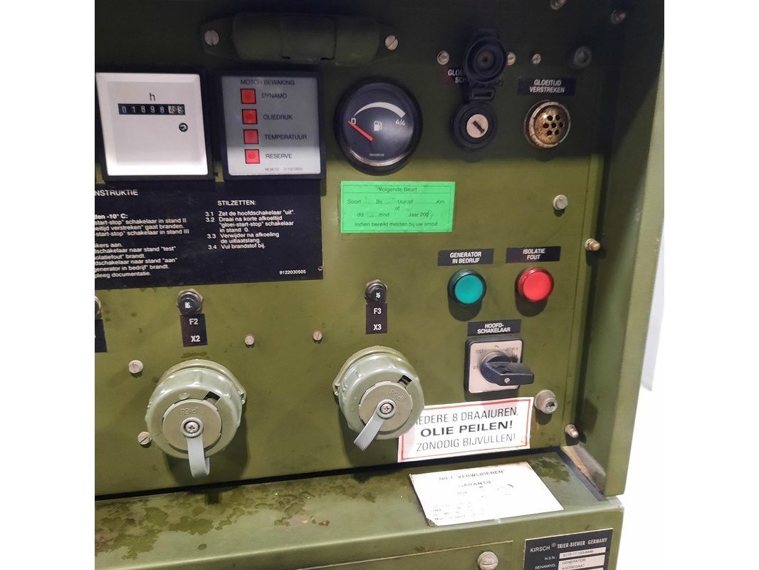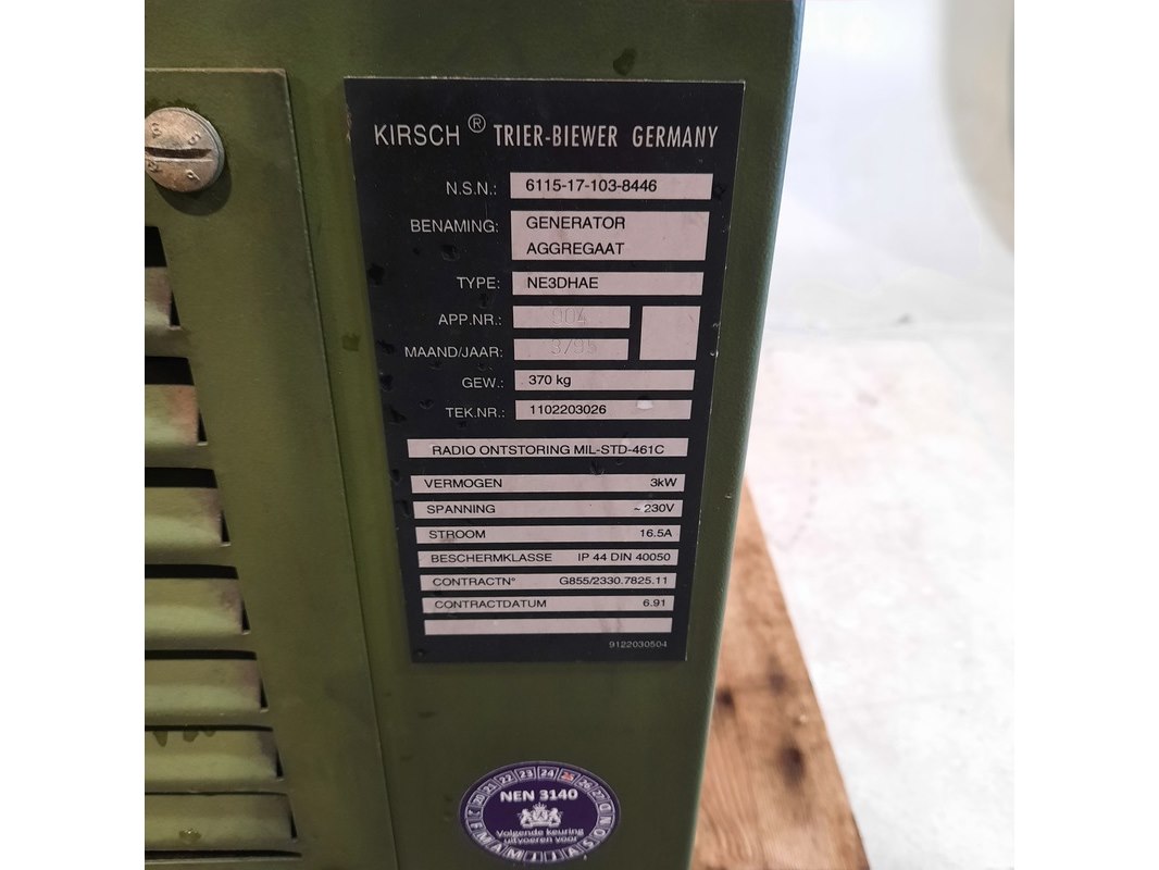 Merk: Kirsch Product: Aggregaat Afmeting: Lxbxh ca. 143x66x85 cm. BouwJaar: 1995 Conditie: Gebruikt Specificaties: Gewicht ca. 370 Kg. 3 kW 16.5A Afgelezen urenstand ca: 1898 Exclusief sleutel Technische staat en compleetheid onbekend.