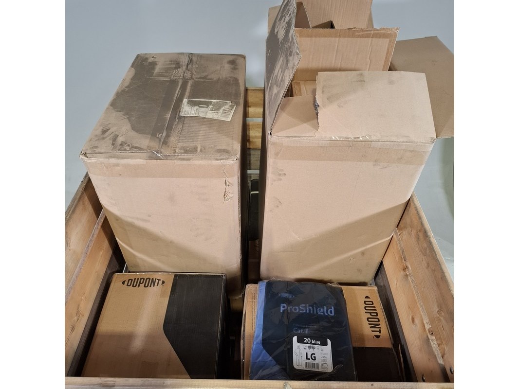 Merk: o.a Dupont Product: Prullenbak en partij werkoveralls Afmeting: Diverse maten Conditie: gebruikt Specificaties: Technische staat en compleetheid onbekend. Exclusief palletkist