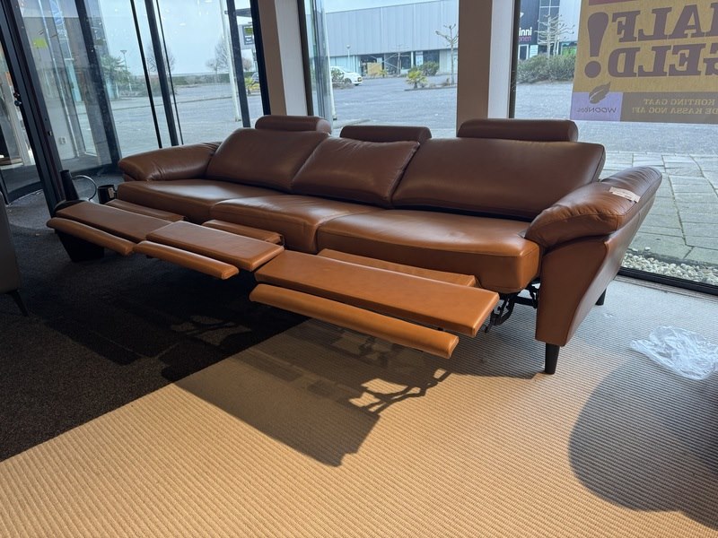 4-zits bank, cognac leder, elektrisch verstelbare relaxfunctie, zwarte poten