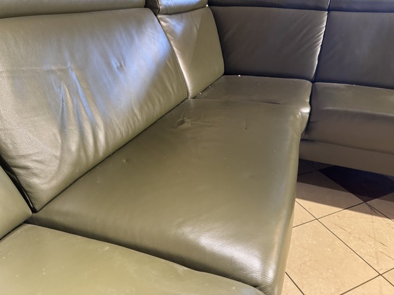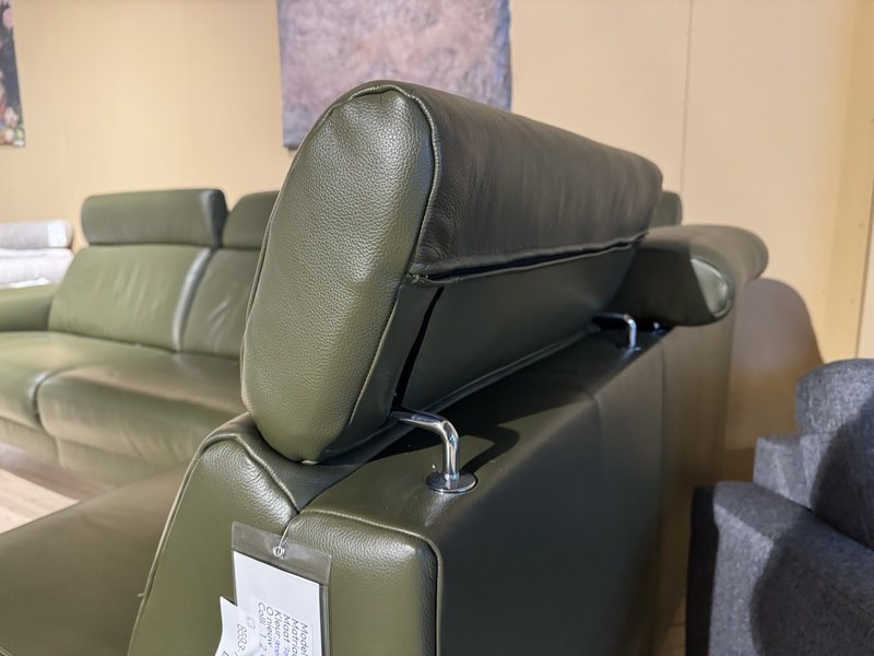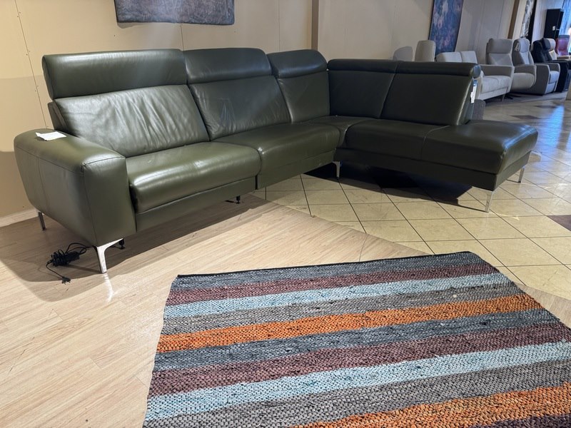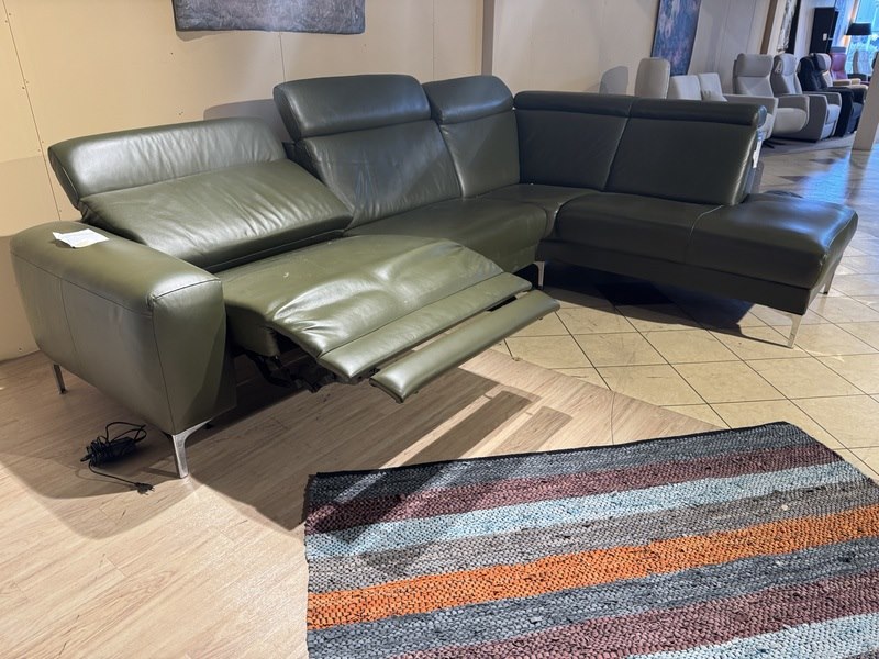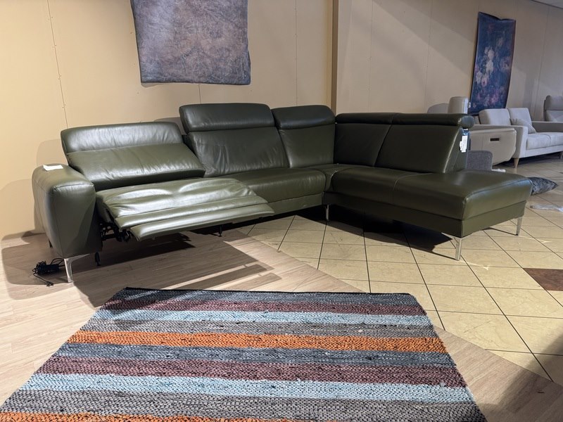Hoekbank met open eiland, groen leder, elektrisch verstelbaar, verstelbare neksteunen