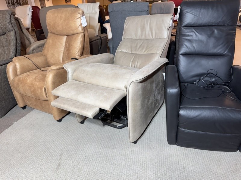 Relaxfauteuil, beige/grijs ecoleder, elektrisch verstelbaar, zwart onderstel