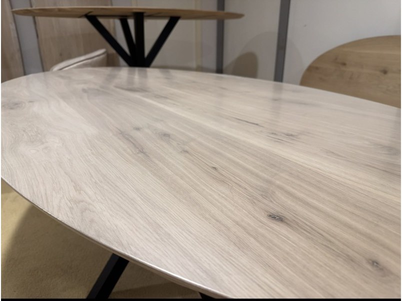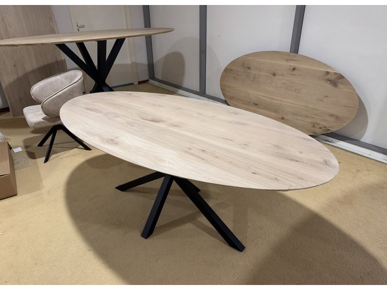 Eettafel, naturel eikenhout, zwart metalen spinpoot