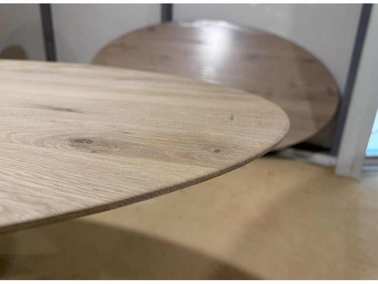 Eettafel, naturel eikenhout, zwart metalen spinpoot