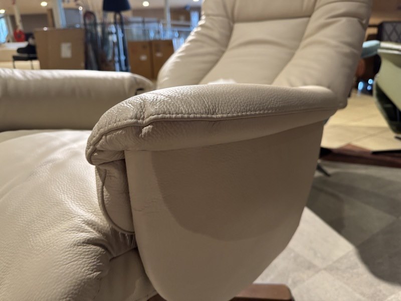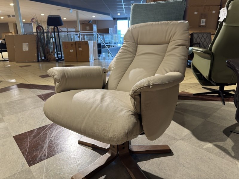Product: Relaxfauteuil Kleur: Beige Materiaal: Leder Specificaties: Showmodel Showmodellen kunnen gebruikssporen en/of beschadigingen hebben. Voor een goed beeld kun je gebruik maken van de kijkdag.