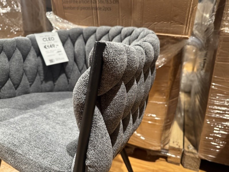 Merk: Home Bound Product: Set van 6 eetkamerstoelen Kleur: Antraciet Materiaal: Stof Afmeting: 62x58x78,5 cm Specificaties: Nieuw in verpakking, 3 colli