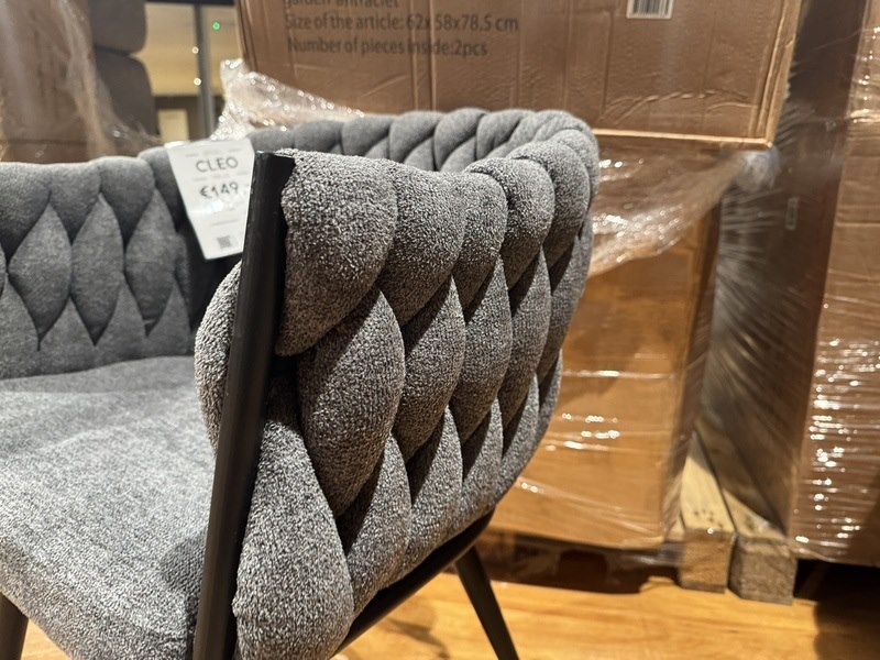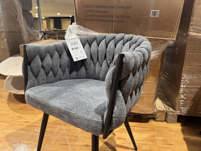 Merk: Home Bound Product: Set van 4 eetkamerstoelen Kleur: Antraciet Materiaal: Stof Afmeting: 62x58x78,5 cm Specificaties: Nieuw in verpakking, 2 colli