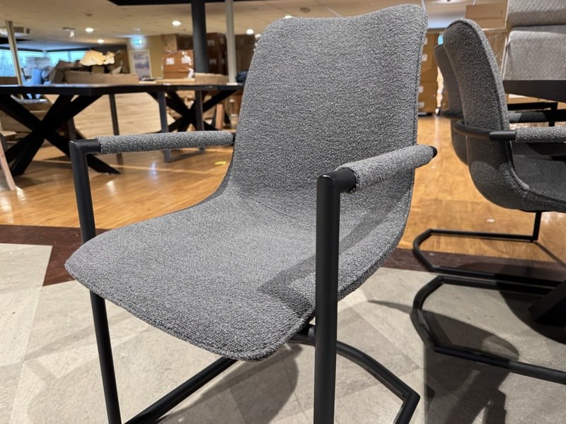 Product: Set van 6 eetkamerstoelen Kleur: Grijs Materiaal: Stof bouclé Specificaties: Nieuw uit verpakking, 6 colli