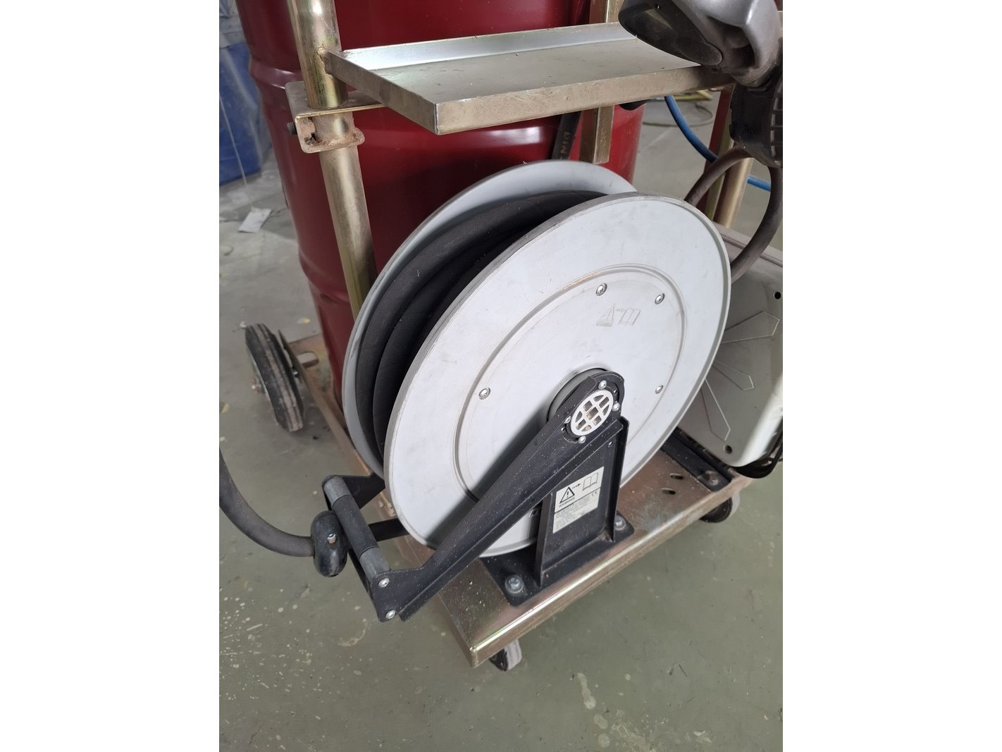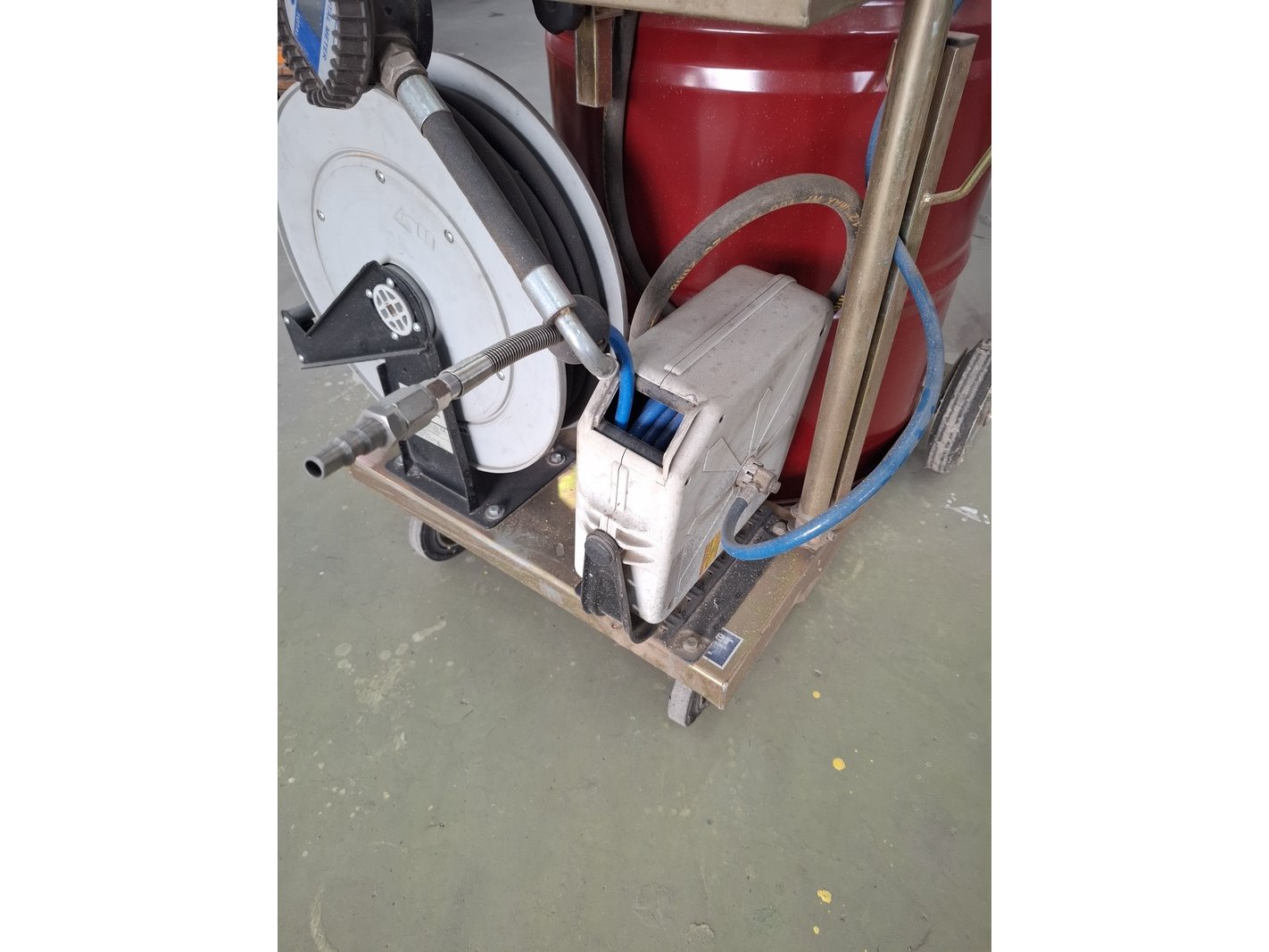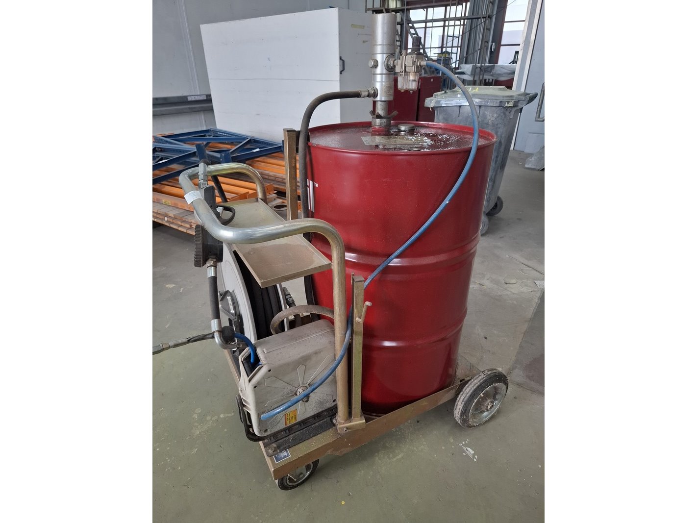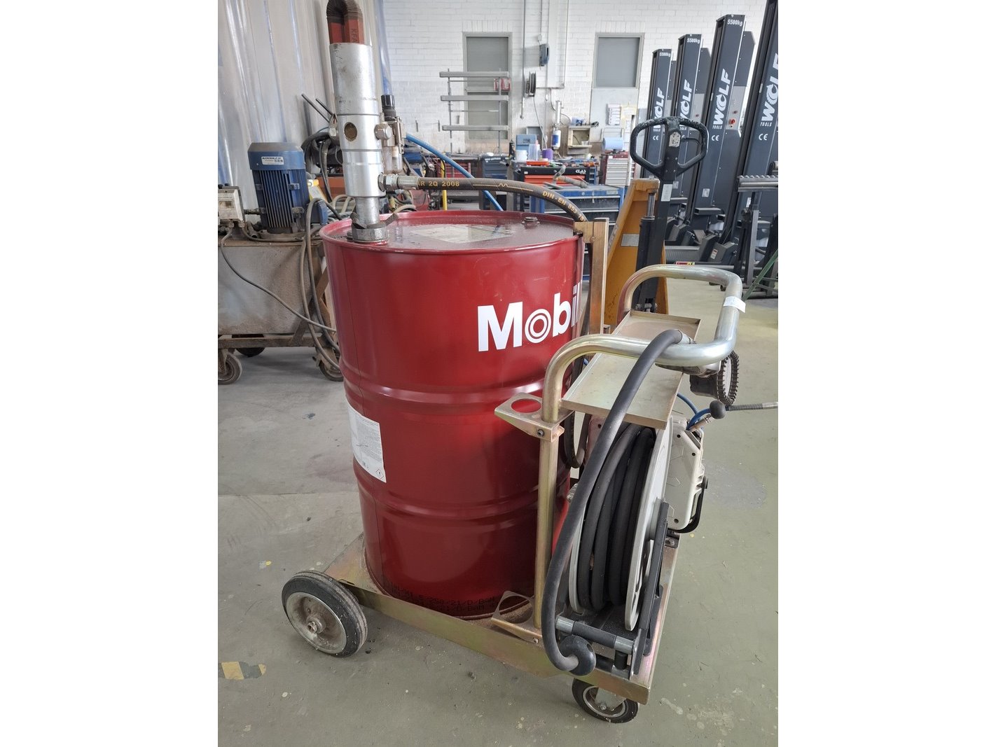 Product: Pneumatische oliepomp Specificaties: op verrijdbaar onderstel, incl. oliedrum (zo goed als vol) Mobil NUTO t/m H46 , max vatinhoud 208ltr