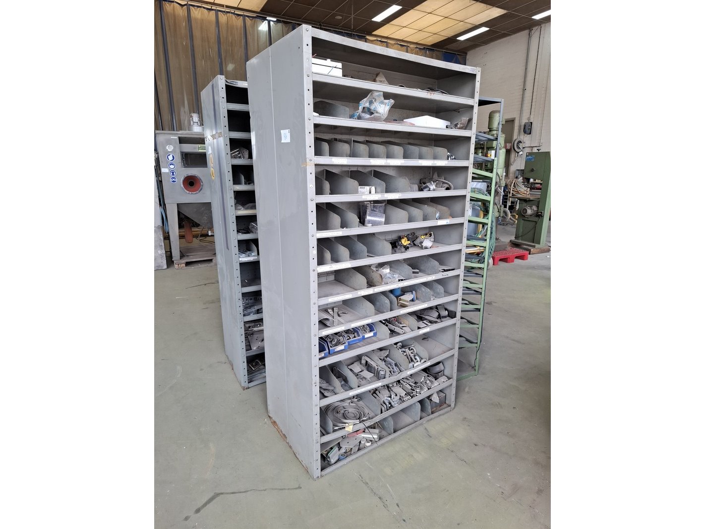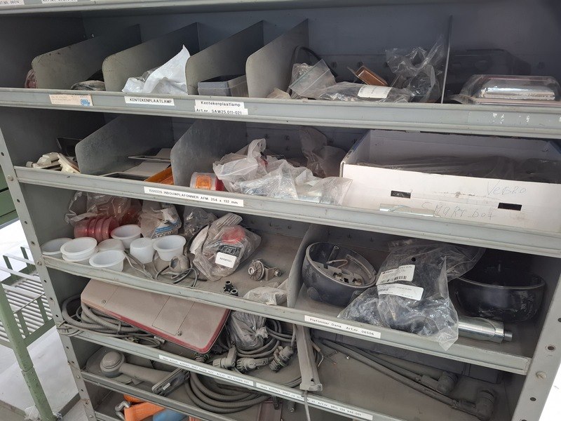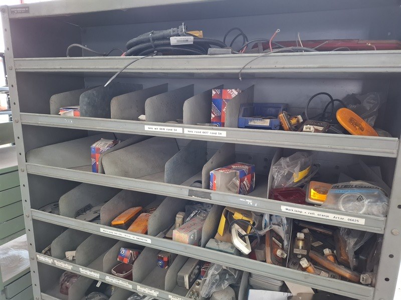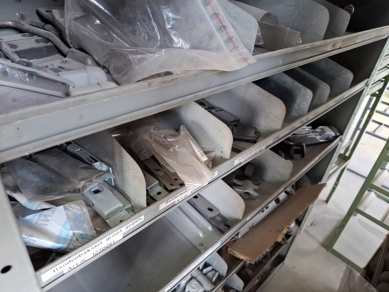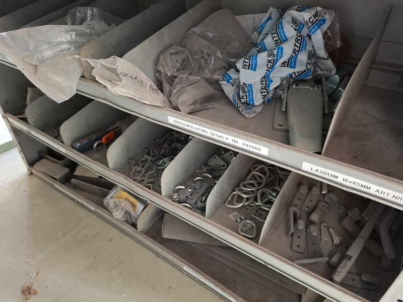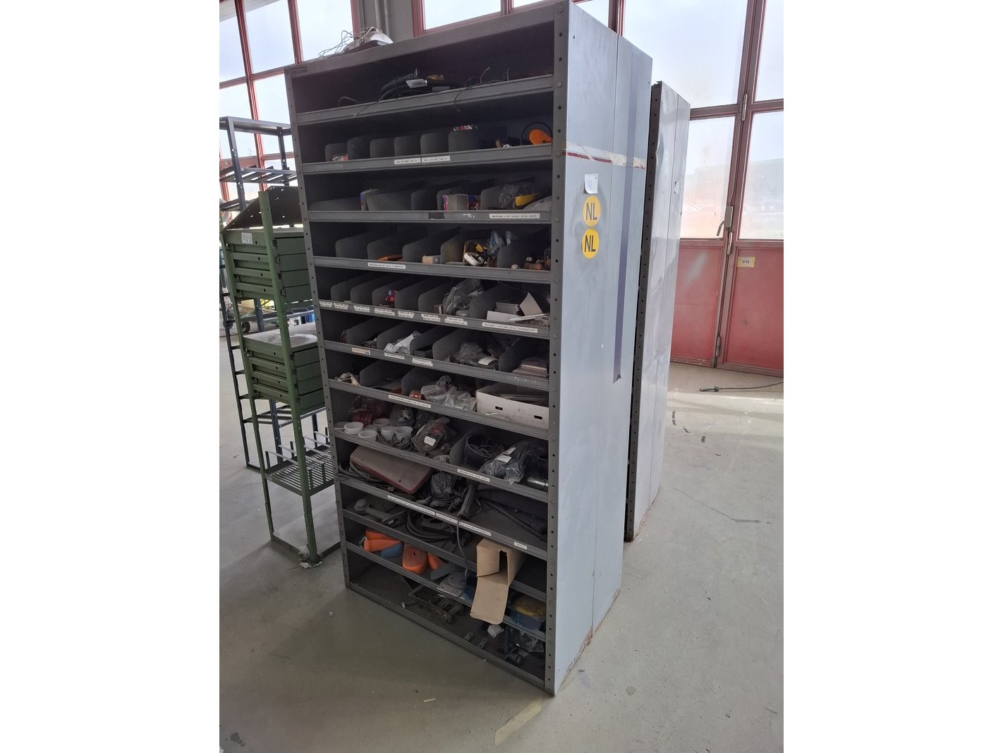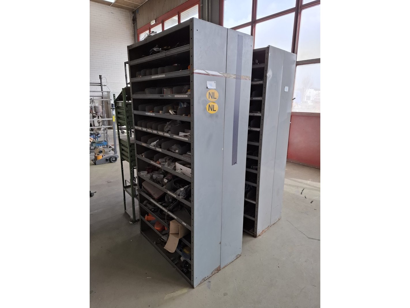 Product: 5x Diverse werkplaatskast Specificaties: bestaande uit: 2x dubbele materiaalkast, hxbxd ca 198x100x60cm; 3x grijpvoorraad stelling max hxb ca 200x54cm; diverse inhoud