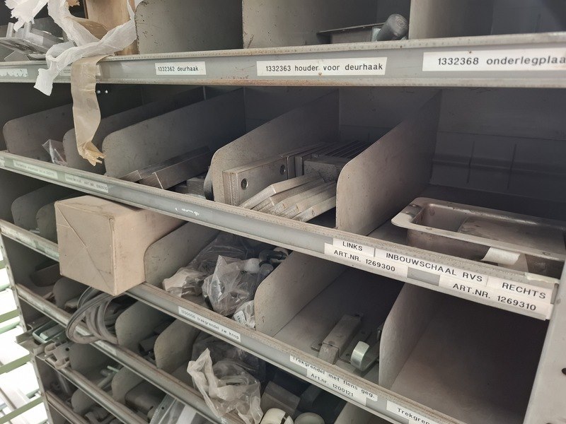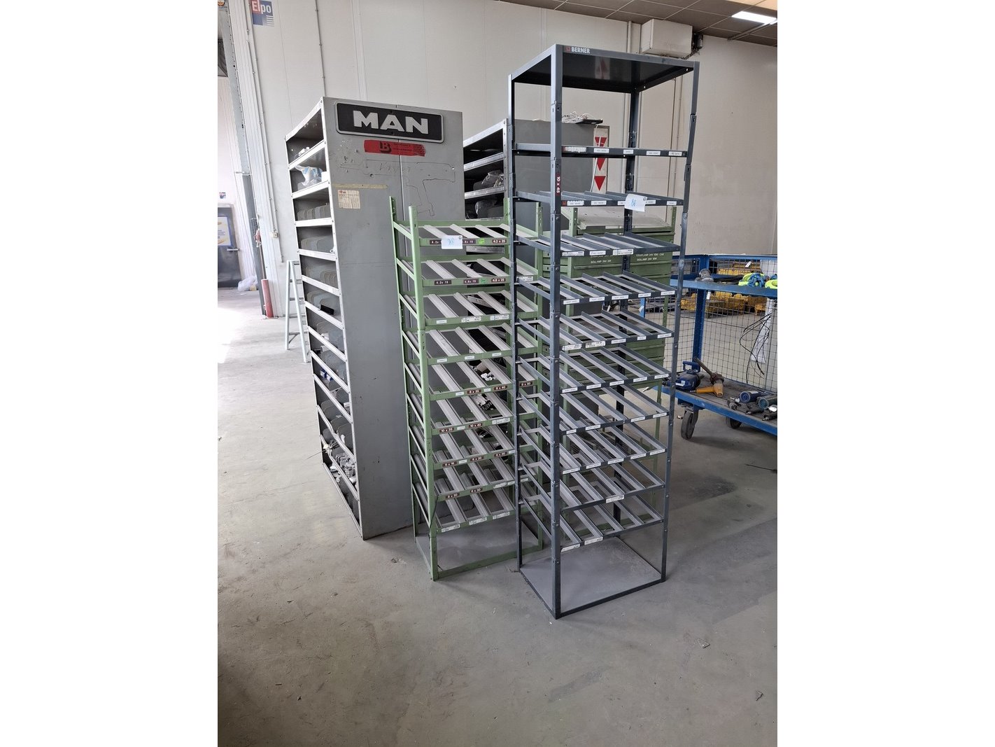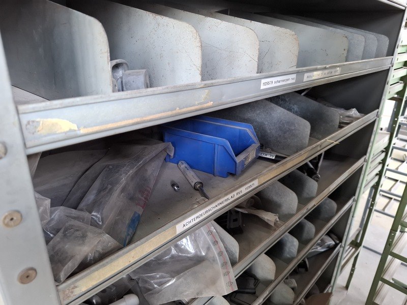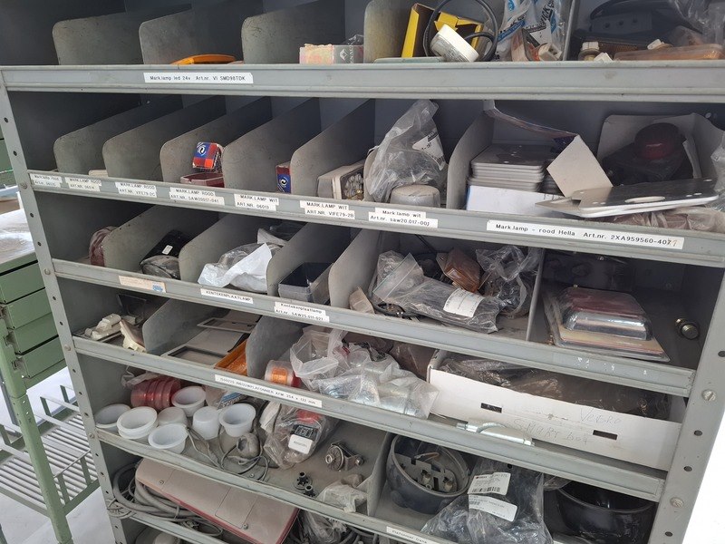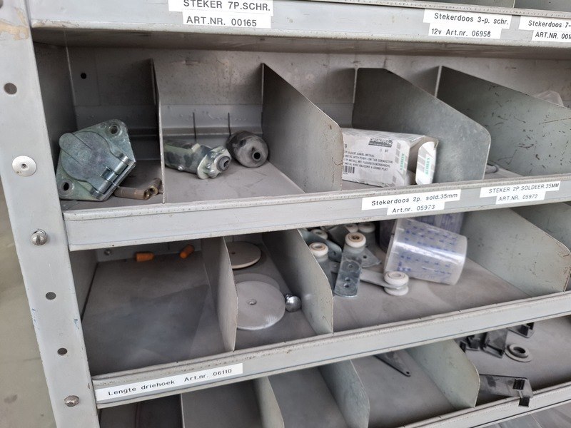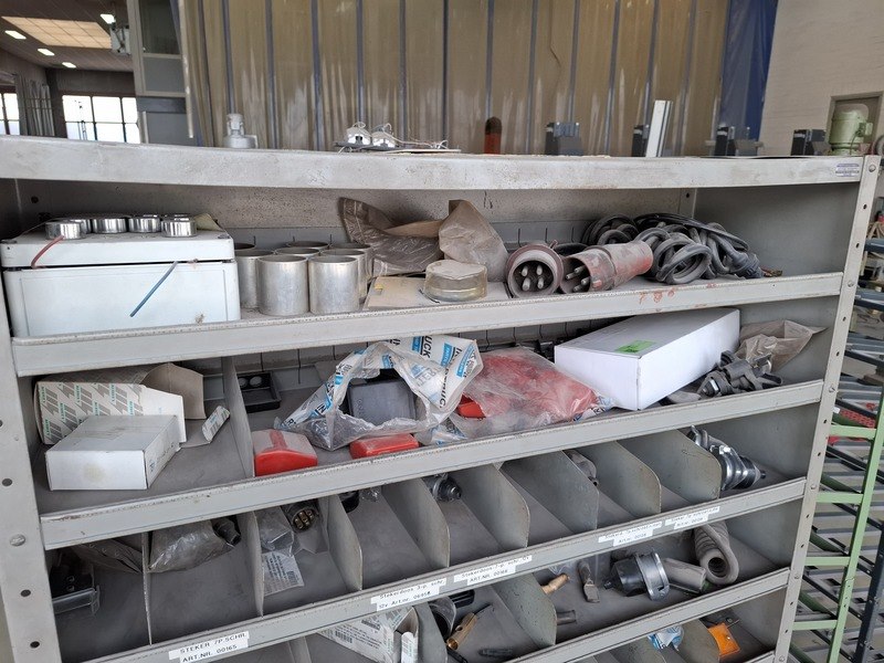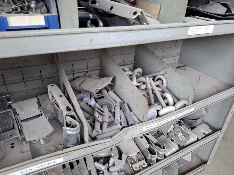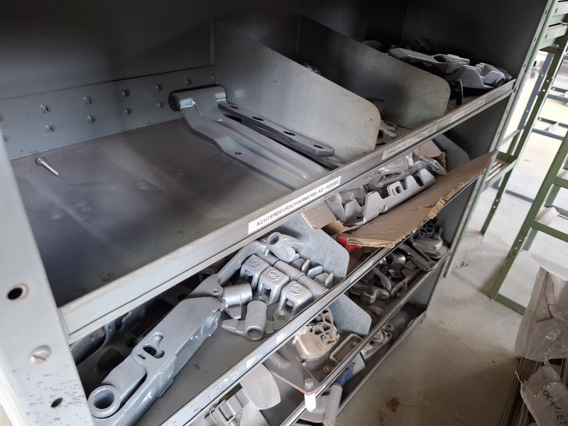 Product: 5x Diverse werkplaatskast Specificaties: bestaande uit: 2x dubbele materiaalkast, hxbxd ca 198x100x60cm; 3x grijpvoorraad stelling max hxb ca 200x54cm; diverse inhoud