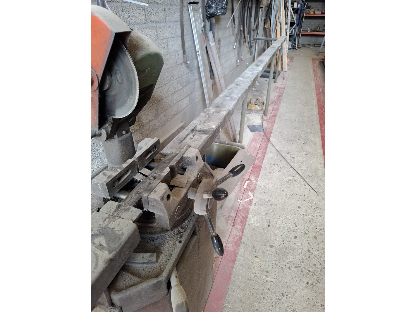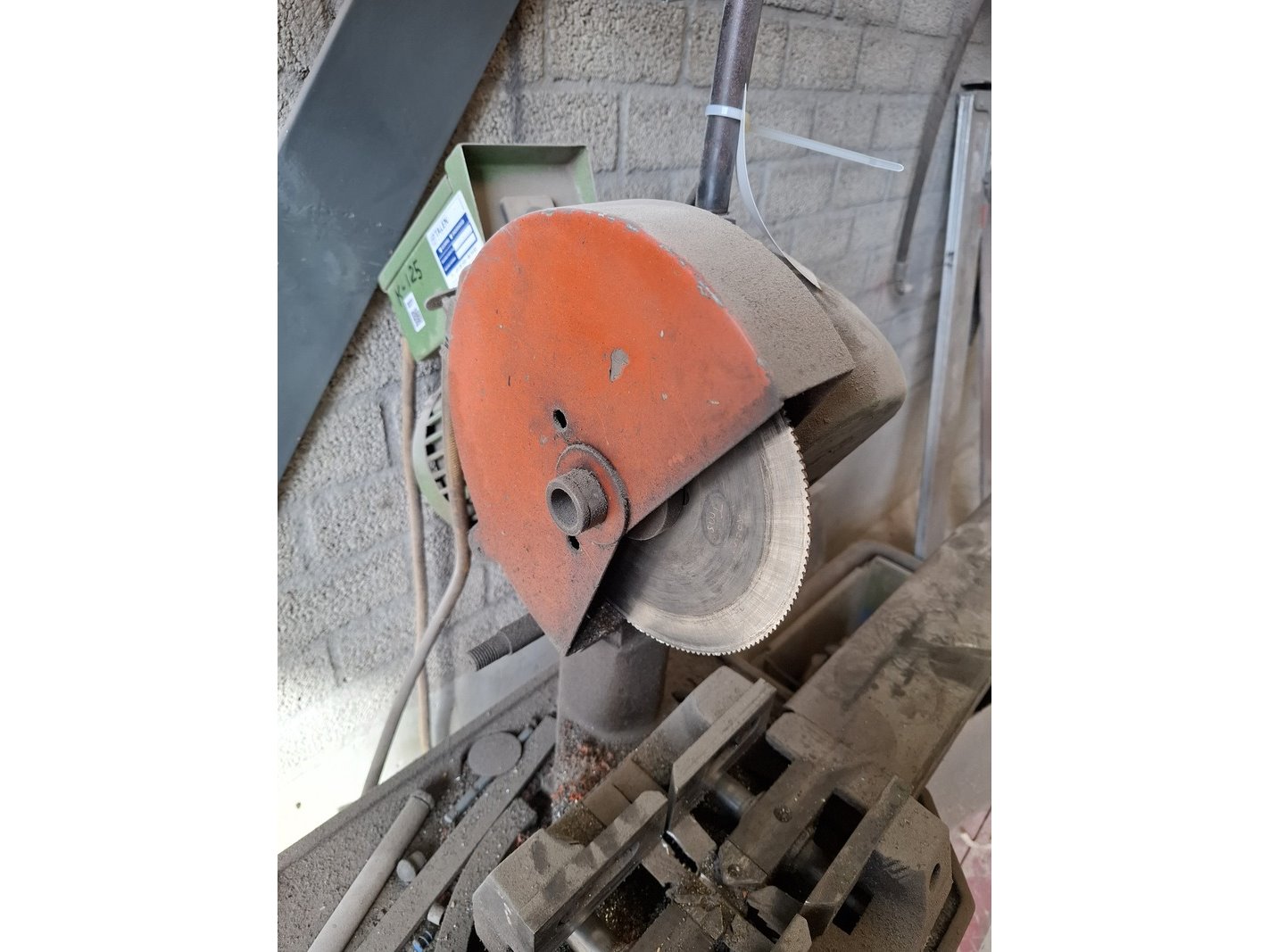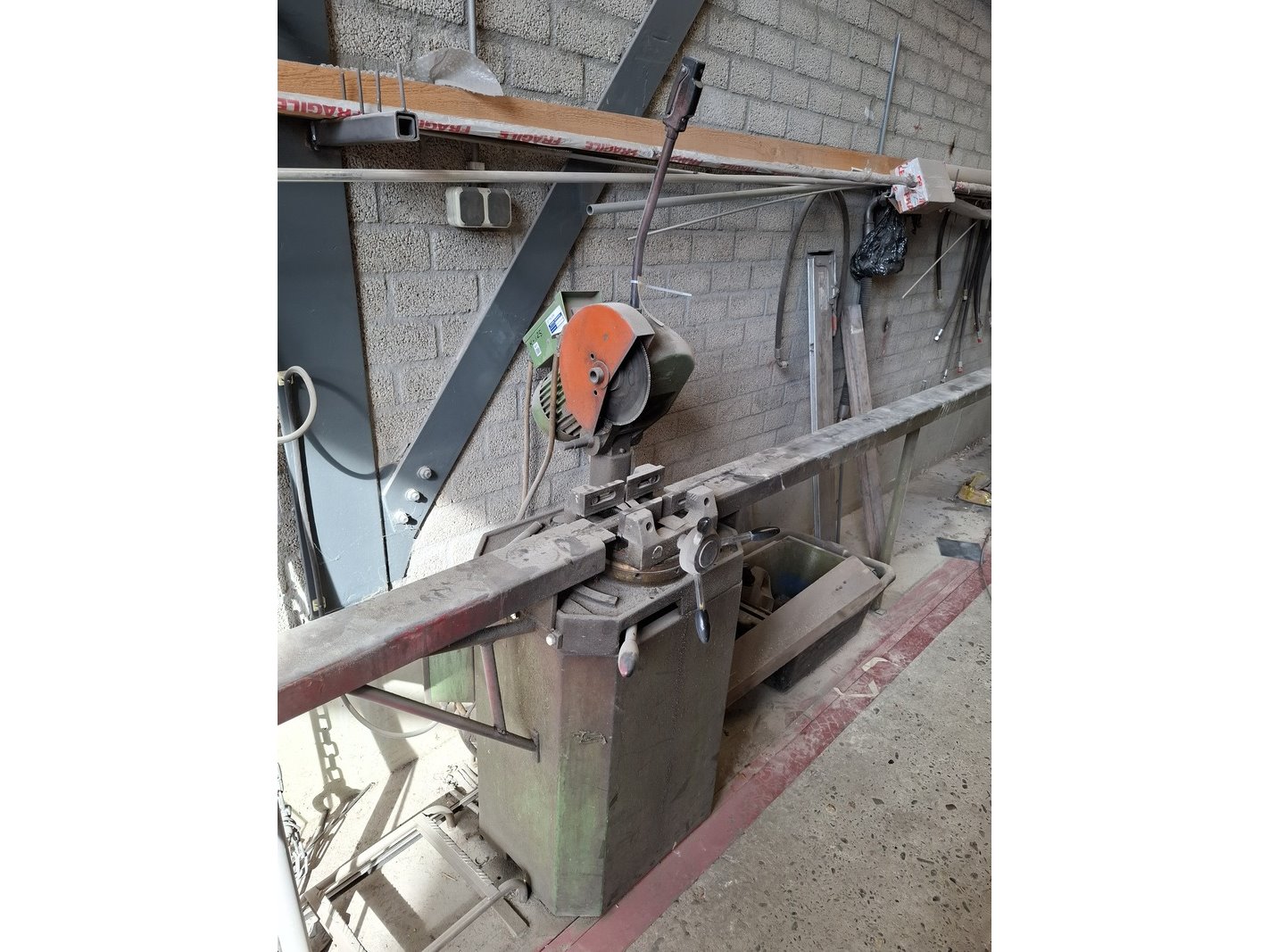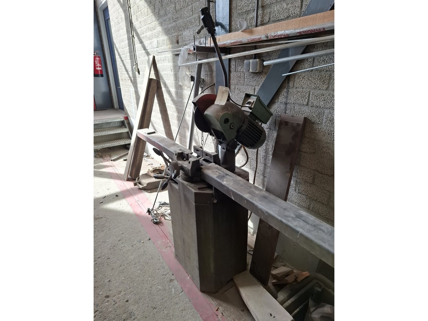 Product: Metaal afkortzaag Afmeting: hoogte ca 170cm Specificaties: 400V, bladdiam ca 250cm, incl. aan- en afvoerbaan totale lengte ca 595cm