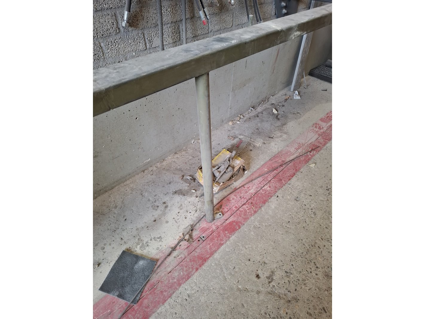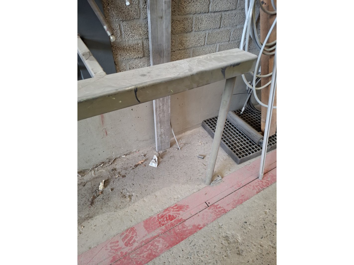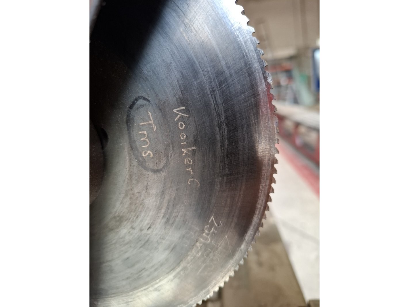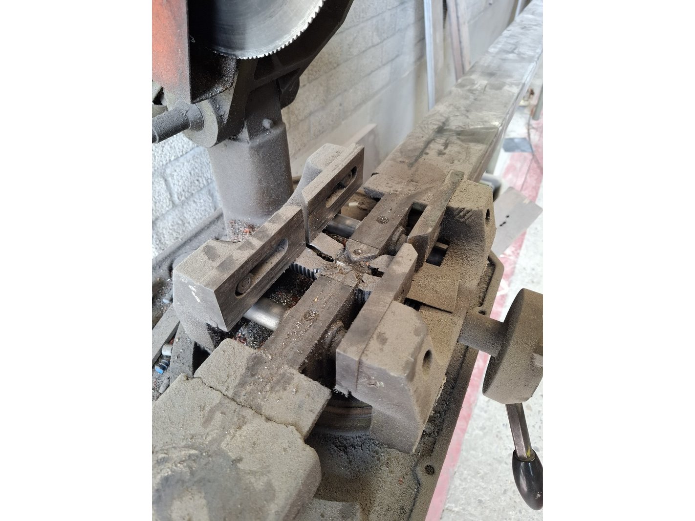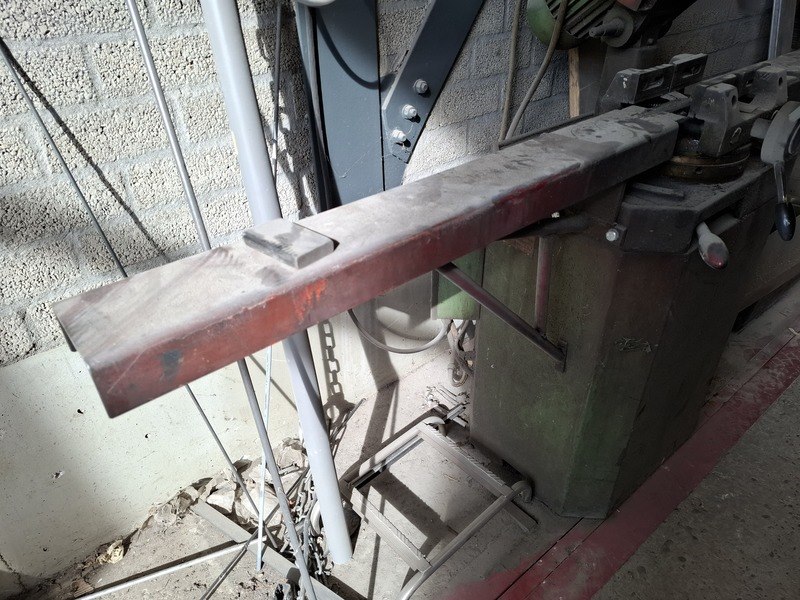 Product: Metaal afkortzaag Afmeting: hoogte ca 170cm Specificaties: 400V, bladdiam ca 250cm, incl. aan- en afvoerbaan totale lengte ca 595cm