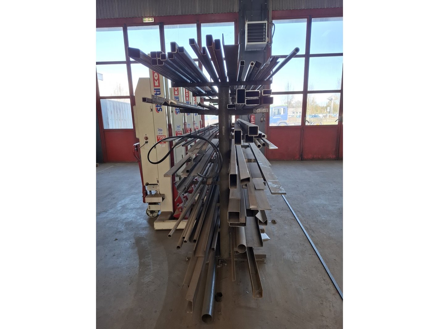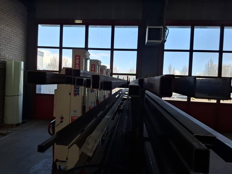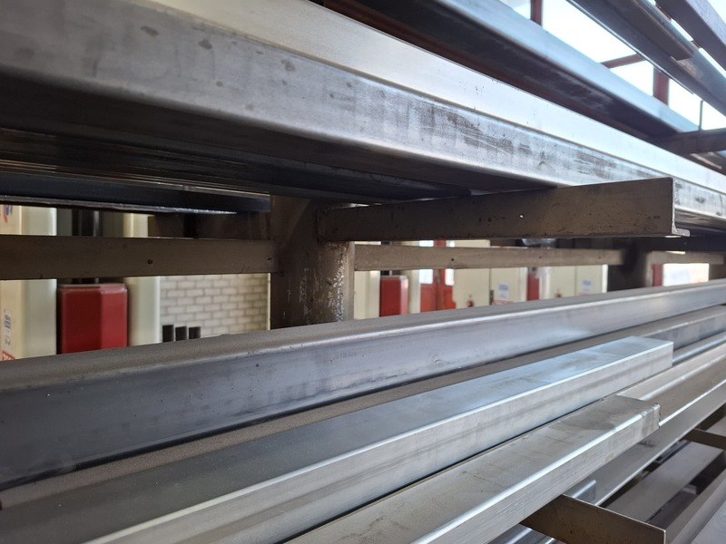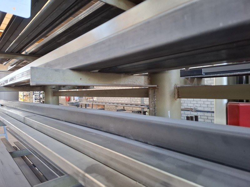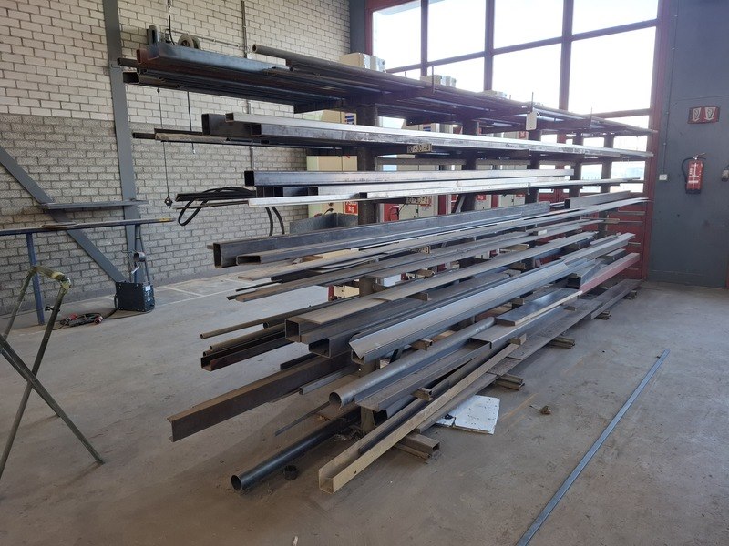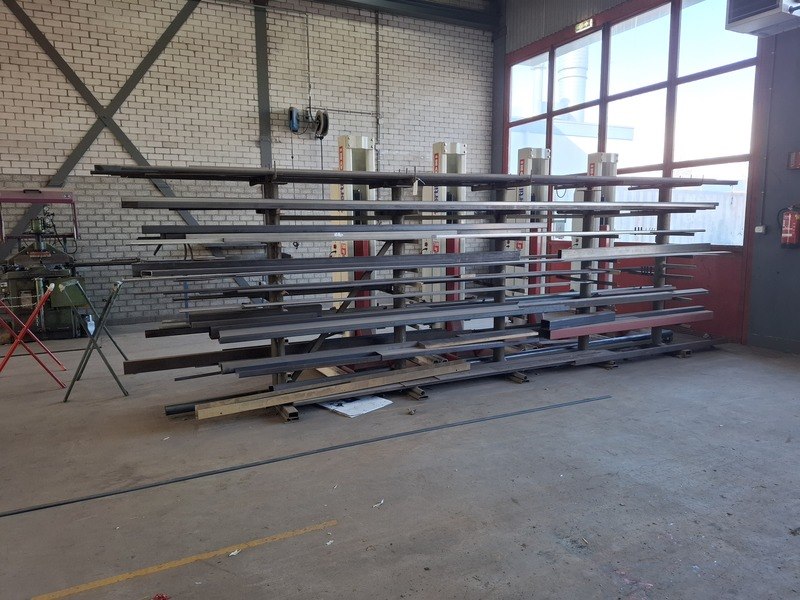Product: Metaalstelling met partij metaal Afmeting: afm. ca 480x85x200cm Specificaties: metalen profielen tot een lengte van 600cm