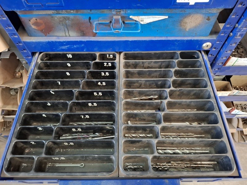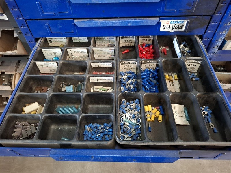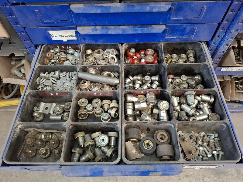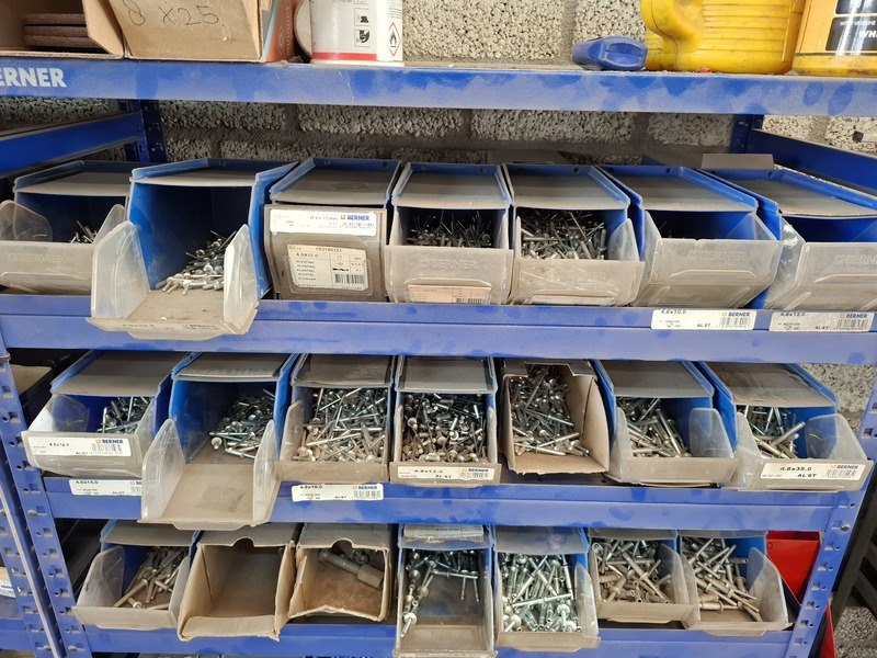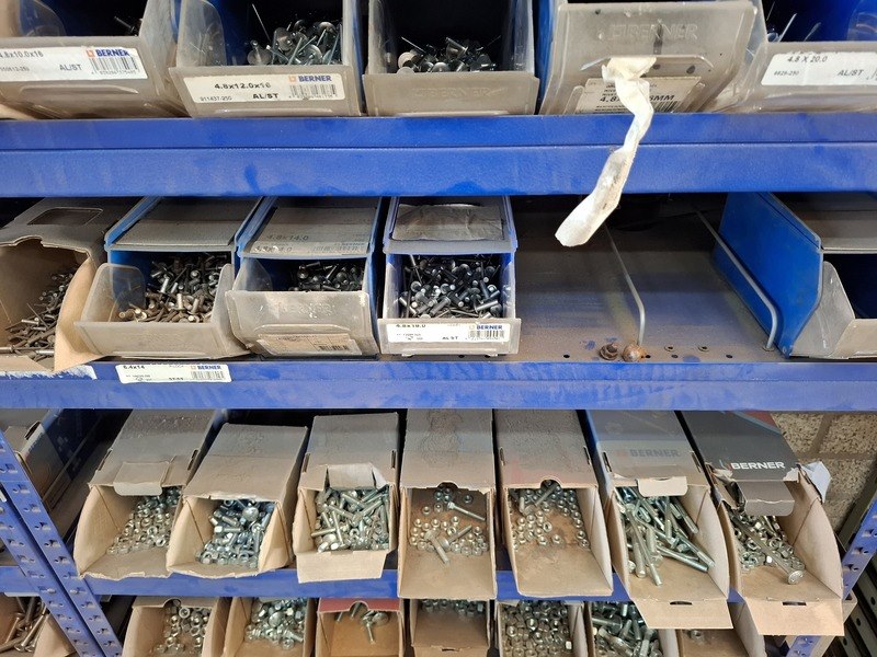 Merk: Berner Product: Grijpvoorraadstelling met inhoud Materiaal: metaal Afmeting: totale hxbxd ca 200x210x36cm Specificaties: inhoud o.a. bouten, moeren, popnagels, borgmoeren, ringen, slotbouten, inbusbouten, etc.