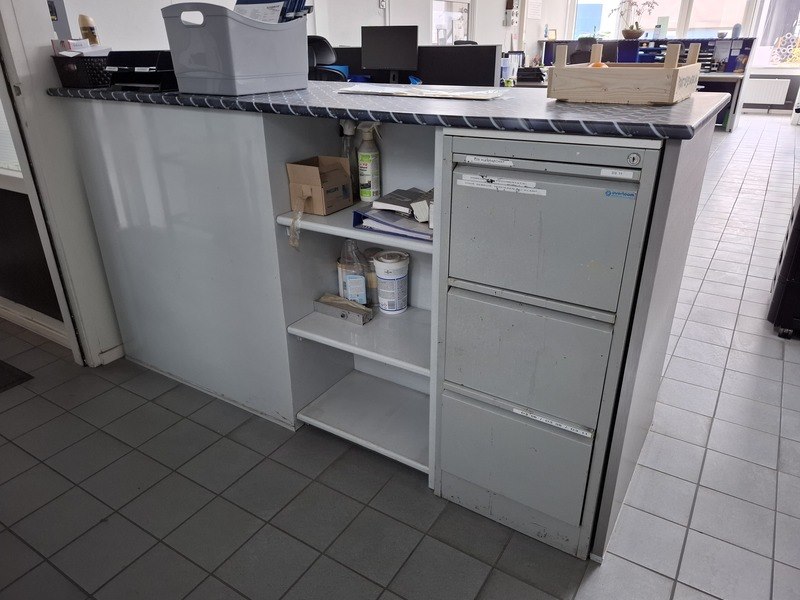 Product: Receptie balieopstelling Specificaties: bestaande uit: ontvangsttafel met 2x stoel; balie, lxbxh ca 324x100x77/125cm; 2x bureaustoel Schaffenburg; lameldeurkast, hxbxd ca 77x120x43cm; balie, hxbxd ca 110x203x80cm; ladekast; etc.
