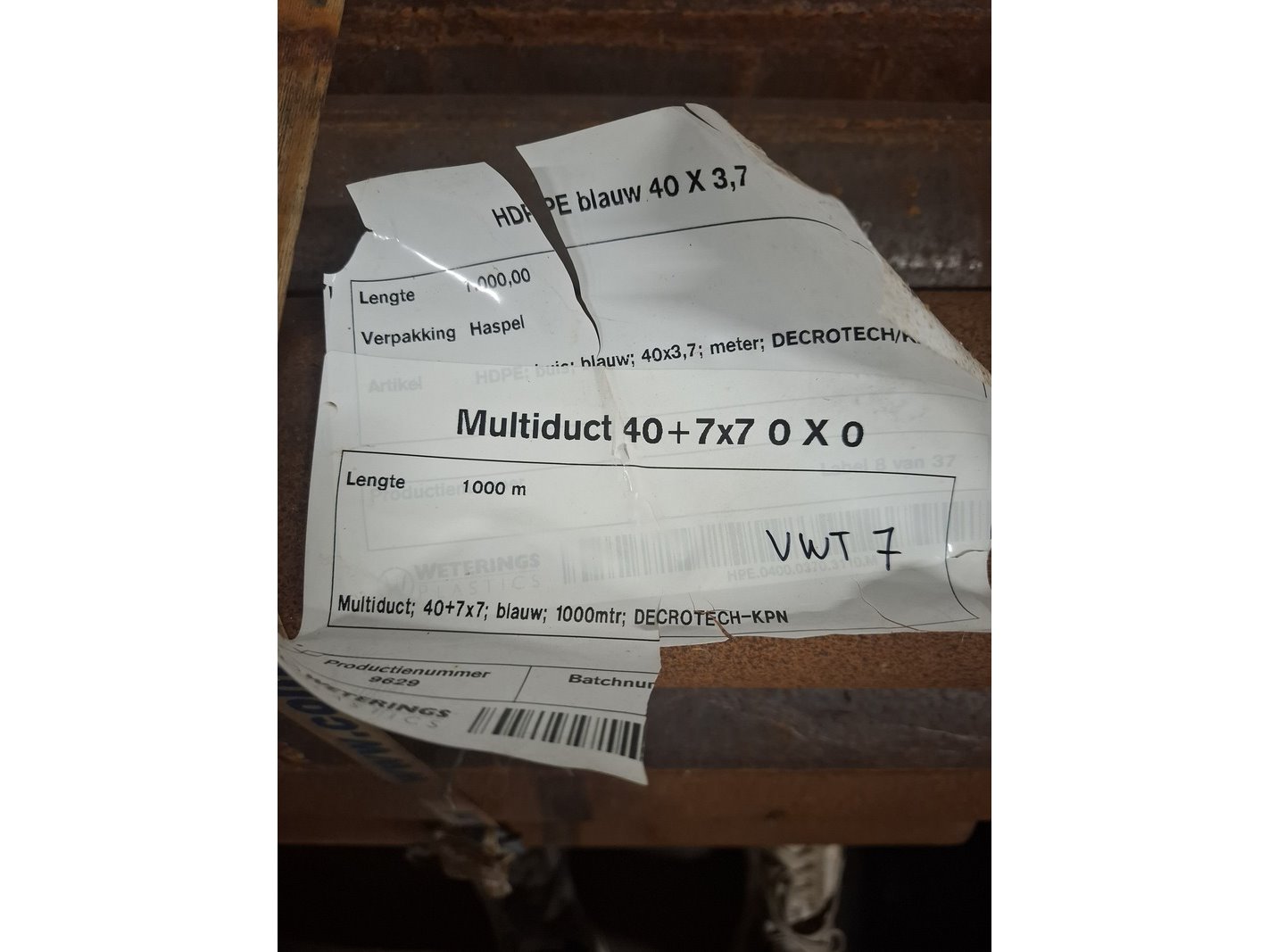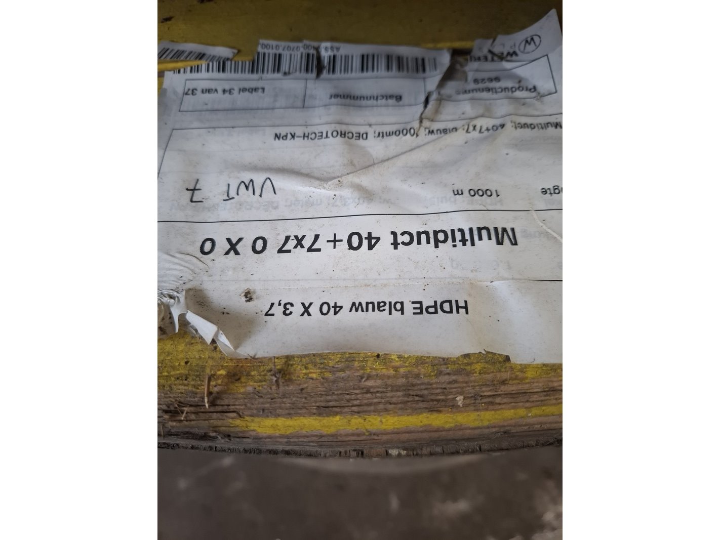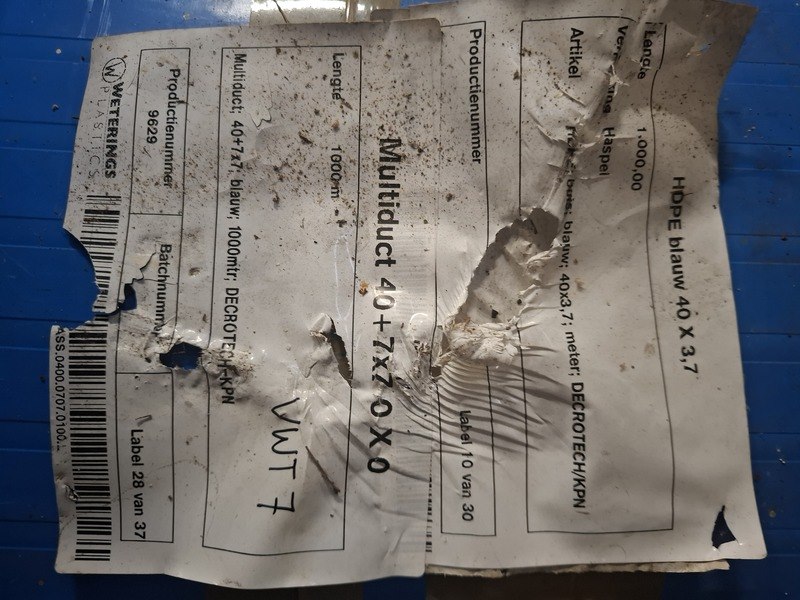 Product: Haspel a 1.000 meter met prefab multiductsysteem voor ondergrondse telecom en glasvezelinfrastructuur Specificaties: 37.000 meter HDPE multiduct 40/7x7 – 37 haspels, geschikt voor glasvezel en telecomprojecten • Lengte per haspel: circa 1.000 meter • Aantal haspels: 37 • Totale lengte: circa 37.000 meter • Bouwvorm: multiduct met meerdere subbuizen in één buitenmantel • Configuratie: 7 subbuizen (binnenbuizen) Conditie • Binnen opgeslagen • Geen aanwijzingen voor functionele schade • Normale lichte opslag of gebruikssporen mogelijk Specificaties – technisch Materiaal • Hoofdmantel: HDPE (High Density Polyethyleen) • Subbuizen: HDPE • Eigenschappen materiaal: -slagvast o -vochtbestendig -geschikt voor ondergrondse toepassing -lange levensduur bij correct gebruik Constructie • Multiductconstructie met 7 afzonderlijke subbuizen • Subbuizen bedoeld voor het inblazen of invoeren van glasvezel of datakabels • Eén gezamenlijke buitenmantel voor mechanische bescherming Leveringsvorm • Prefab geleverd • Op haspels gewikkeld Toepassingsgebied • Glasvezelnetwerken • Telecom en datanetwerken • Civiele infrastructuur • Projectmatige aanleg en netwerkuitbreiding Verwerking • Geschikt voor ondergrondse aanleg • Te gebruiken in combinatie met gangbare telecom en infratechnieken • Inzetbaar voor aannemers en infrabedrijven