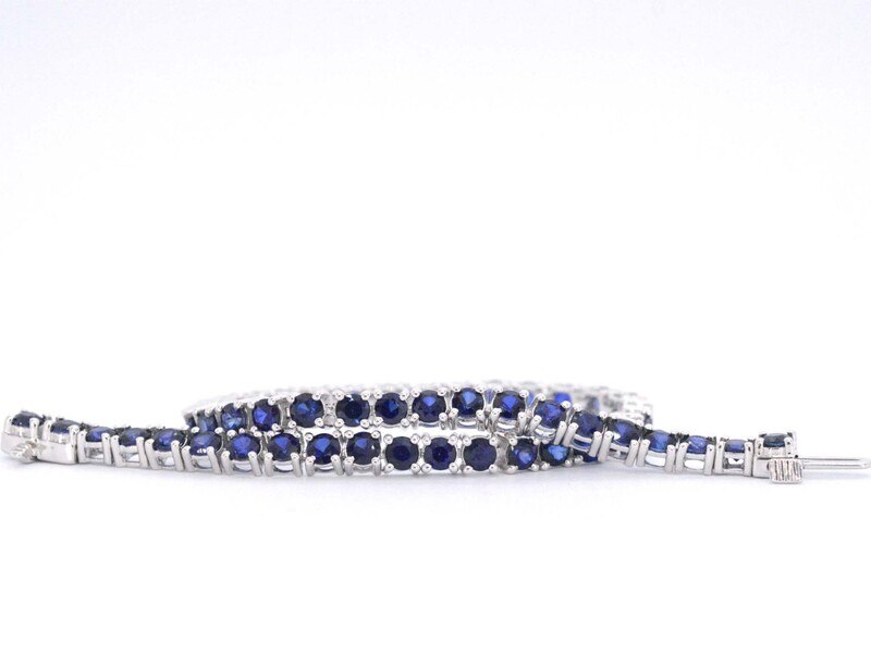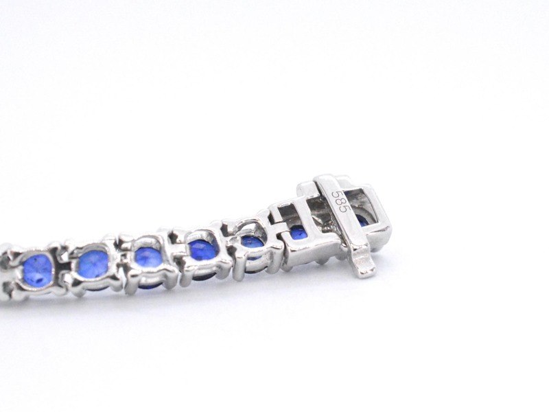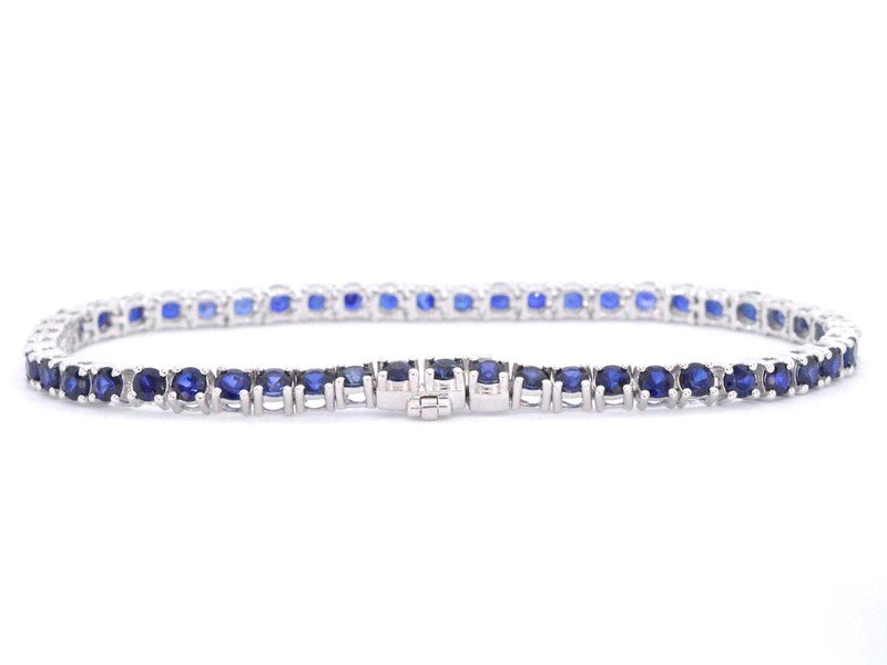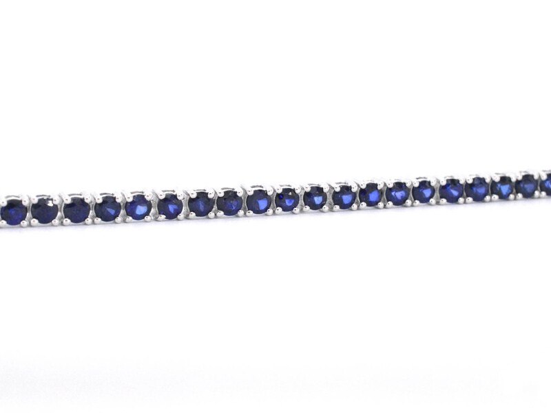 Product: Witgouden tennisarmband met saffieren Specificaties: Edelsteen: Saffier Slijpvorm: Briljant geslepen Gewicht (carat): 7.50 carat Kleur: blauw Zuiverheid: Met natuurlijke insluitsels Slijpkwaliteit: Very good Juweel: Armband Gewicht: 10 gram Afmetingen/lengte: 18 cm Materiaal: 14 karaat (585) Conditie: Nieuw Verpakking: Luxe sieradendoos Toelichting: De kwaliteit is overgenomen van het rapport behorend bij item. De waardebepaling is een beoordeling van een gecertificeerde diamantair, gebaseerd op consumentenprijzen. Consumentenprijs: € 6.930,-