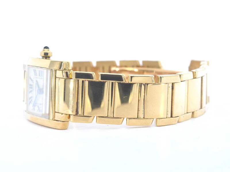 Product: Cartier - Tank Francaise goud Specificaties: Horloge (Merk): Cartier Model: Tank francaise Referentie: 1820 Jaar: 1998 Wijzerplaat: Wit Klok (type): Quartz Kast doorsnede: 20 mm Materiaal: 18K goud Toebehoren: Orginele doos en papieren Juweel: Horloge Gewicht: 73,5 gram Afmetingen/lengte: 18- 19 cm Materiaal: 18k Goud (750) Conditie: Zo goed als nieuw Verpakking: Orginele doos Toelichting: De kwaliteit is overgenomen van het rapport behorend bij item. De waardebepaling is een beoordeling van een gecertificeerde diamantair, gebaseerd op consumentenprijzen. Consumentenprijs: € 25.900,-