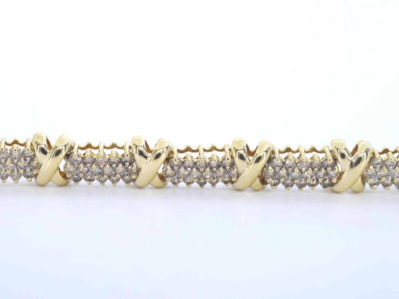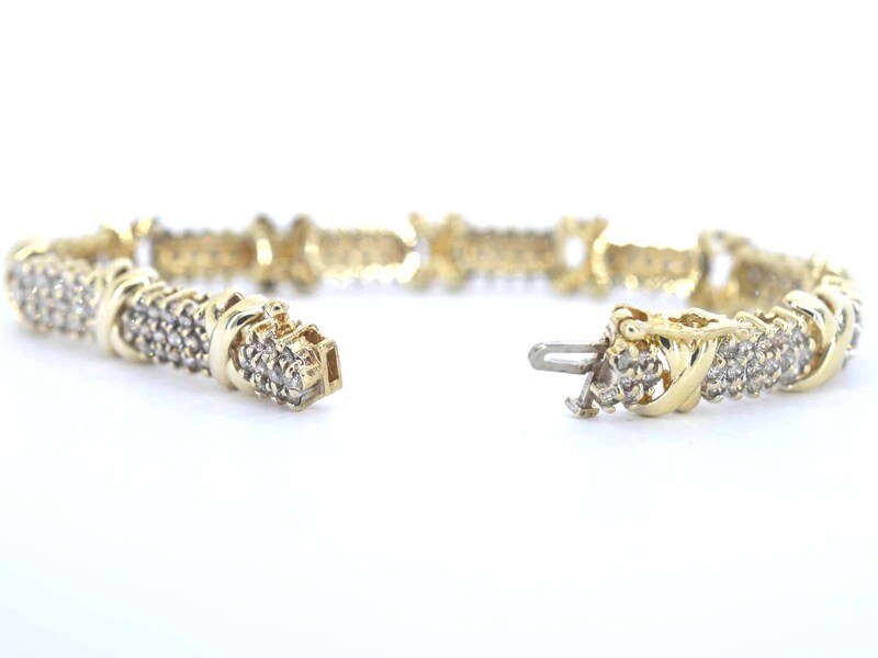 Product: Exclusieve armband met natuurlijke diamanten Specificaties: Diamant: Natuurlijk Aantal: ca. 165 stuks Slijpvorm: Briljant geslepen Gewicht (carat): 5.00 carat Kleur: Warm getint Zuiverheid: SI-P Slijpkwaliteit: Mooi Juweel: Armband Gewicht: 21 gram Afmetingen/lengte: 18.5 cm Materiaal: 10k goud (bwgg) Conditie: Zo goed als nieuw Verpakking: Luxe sieradendoos Toelichting: De kwaliteit is overgenomen van het rapport behorend bij item. De waardebepaling is een beoordeling van een gecertificeerde diamantair, gebaseerd op consumentenprijzen. Consumentenprijs: € 20.000,-