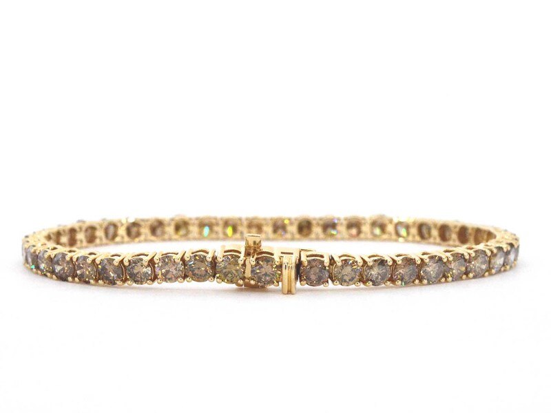 Product: Gouden armband met diamanten 10.00 carat Specificaties: Diamant: Natuurlijk Aantal: 45 stuks Slijpvorm: Briljant geslepen Gewicht (carat): 10.00 carat Kleur: Fancy goud - champagne - cognac Zuiverheid: VS-SI-P Slijpkwaliteit: Zeer mooi Juweel: Armband Gewicht: 12 gram Afmetingen/lengte: 17.5 cm Materiaal: 14k goud (585) Conditie: Nieuw Verpakking: Luxe sieradendoos Toelichting: De kwaliteit is overgenomen van het rapport behorend bij item. De waardebepaling is een beoordeling van een gecertificeerde diamantair, gebaseerd op consumentenprijzen. Consumentenprijs: € 27.563,-