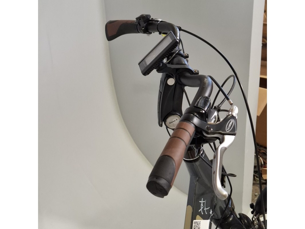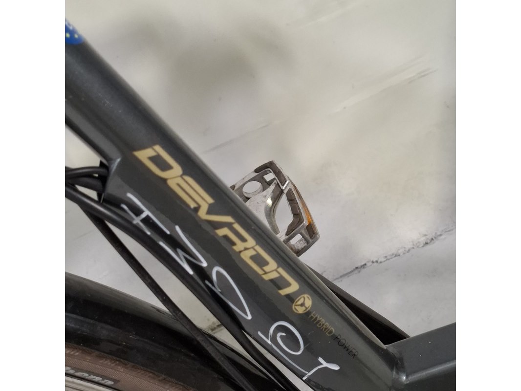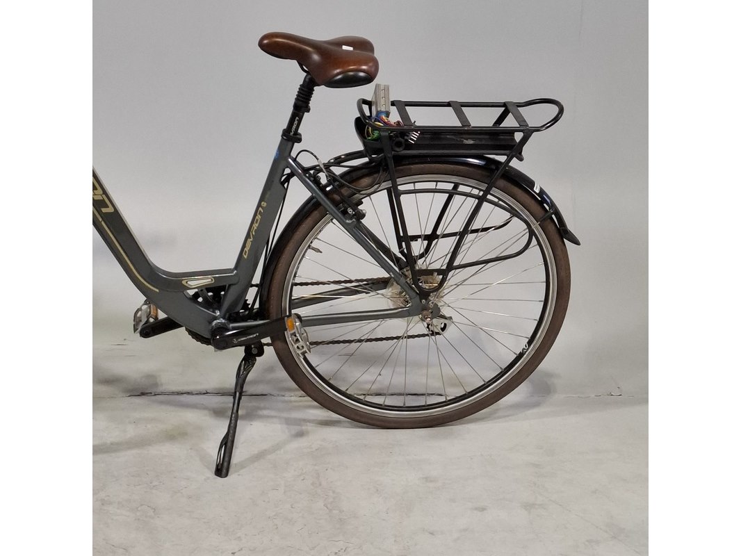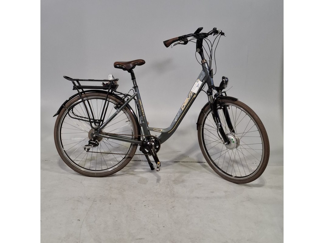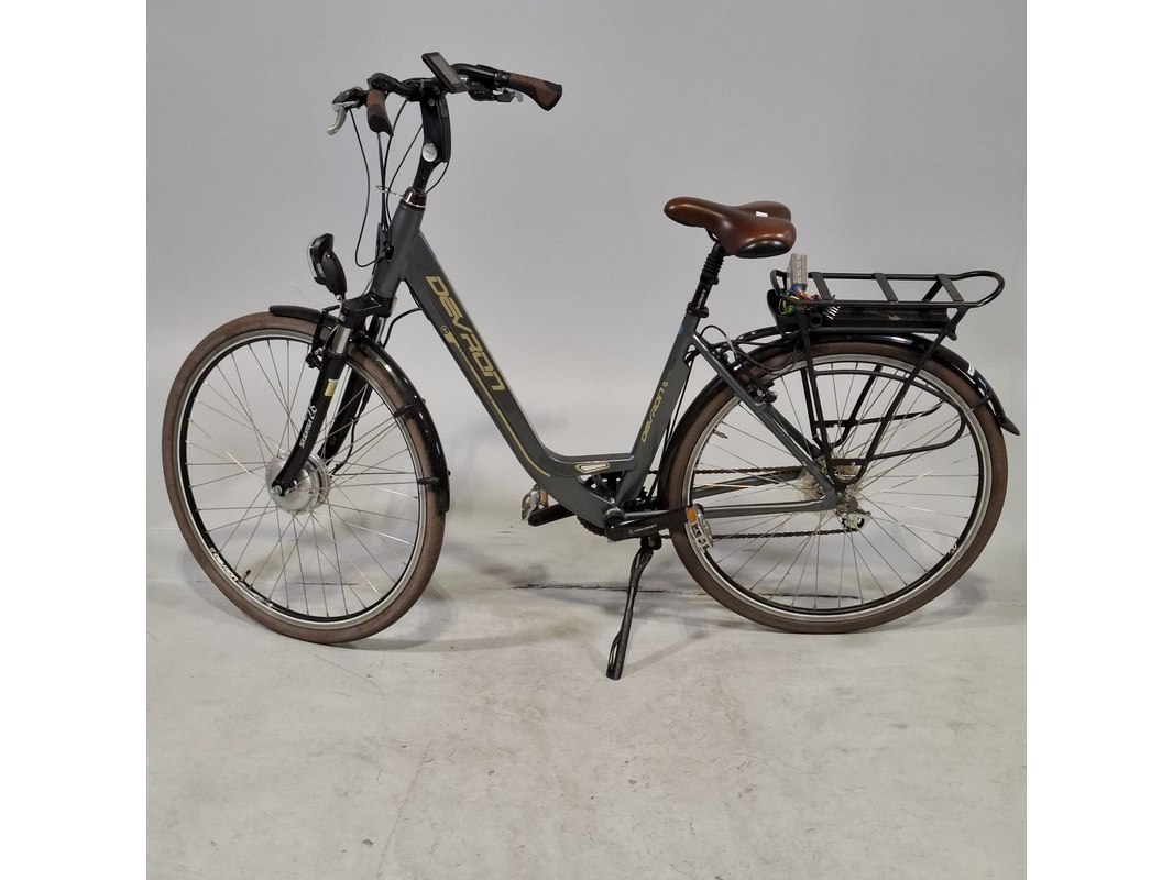 Merk: Devron Product: Elektrische damesfiets Afmeting: Framemaat ca. 50 cm Specificaties: Geveerde voorvork en zadelpen 7 versnellingen Inclusief fietscomputer. Exclusief accu, acculader en sleutels. Bevestigingsplaat accu hangt los.