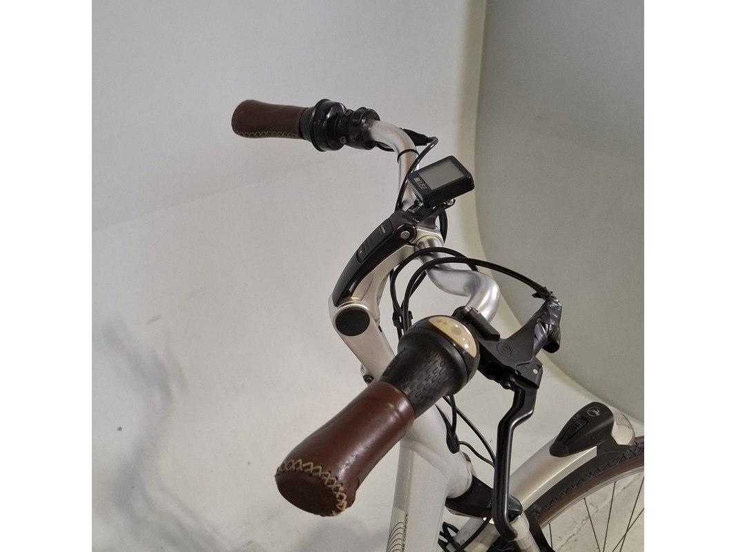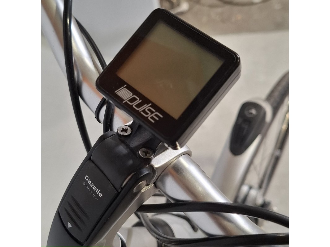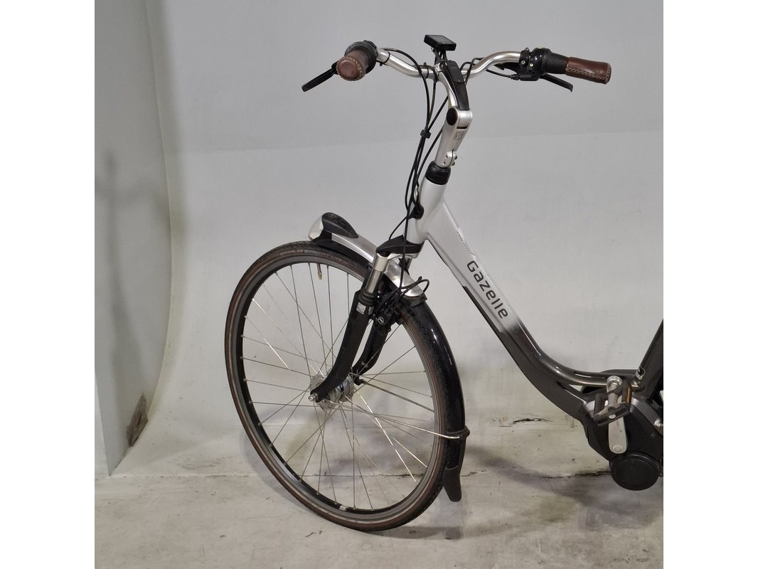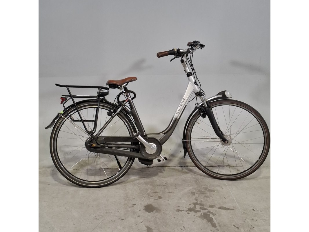 Merk: Gazelle Product: Elektrische damesfiets Afmeting: Framemaat ca. 49 cm Specificaties: Geveerde voorvork en zadelpen 8 versnellingen Uitgerust met middenmotor. Inclusief display, exclusief accu en acculader. Sleutel accu ontbreekt