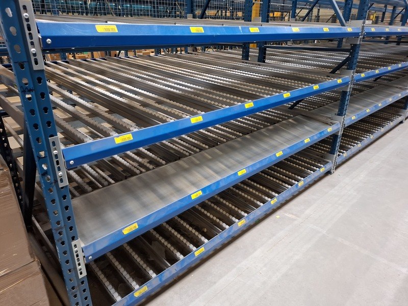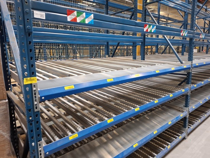 Merk: Polypal Product: Push trough stelling Specificaties: lengte ca 14x2,4x4,5mtr, bestaande uit ca 60 liggers en 6 jukken