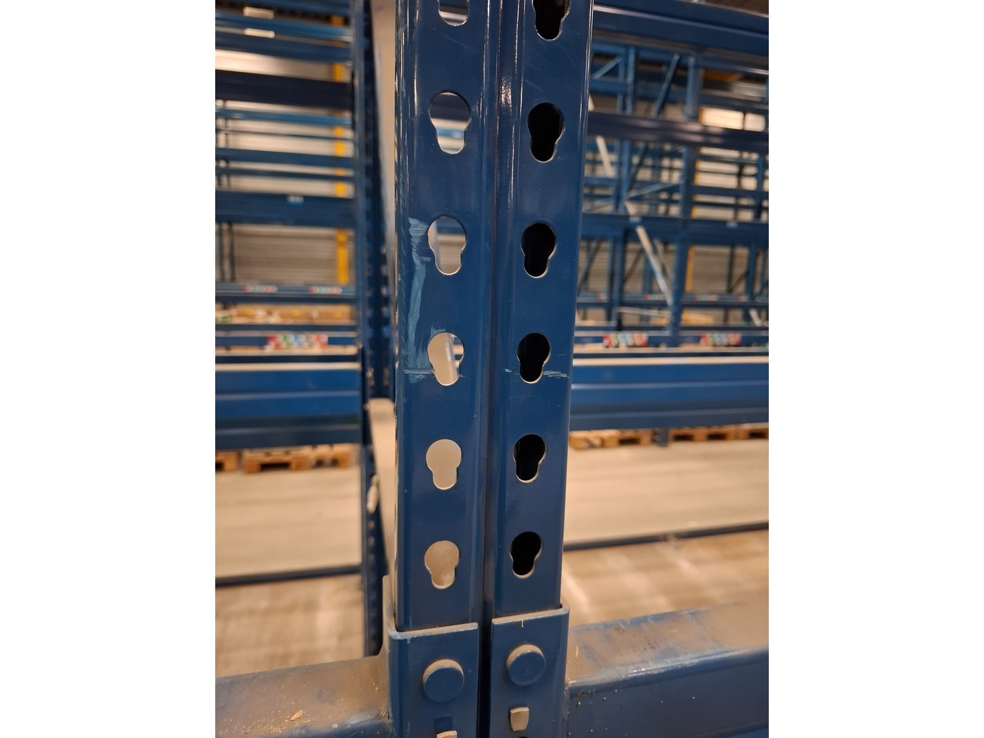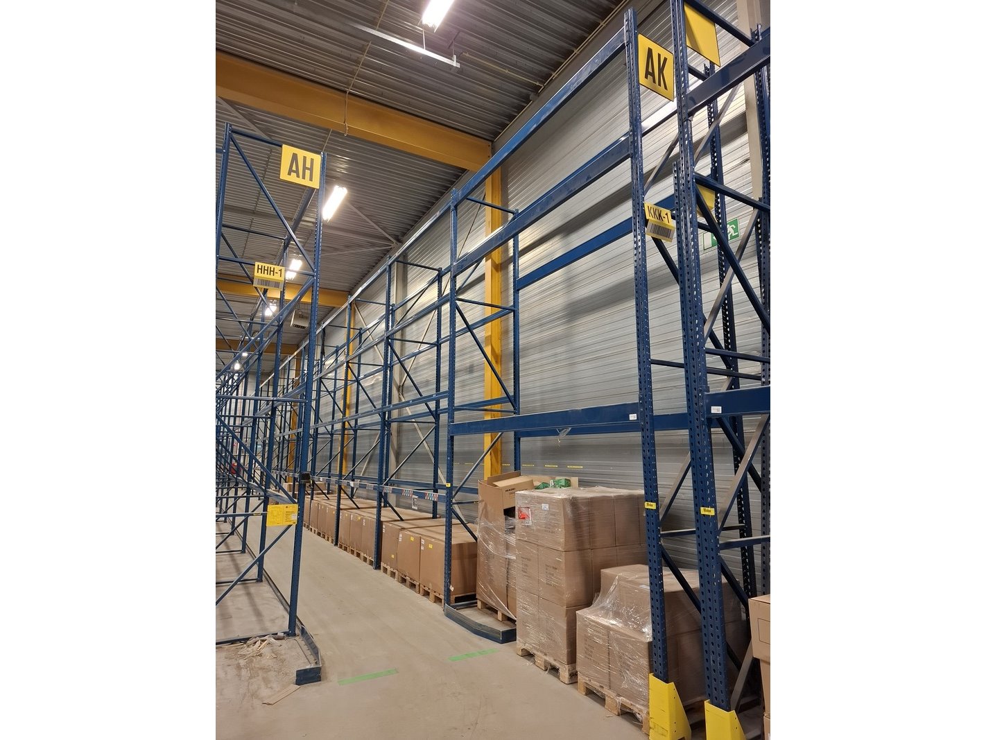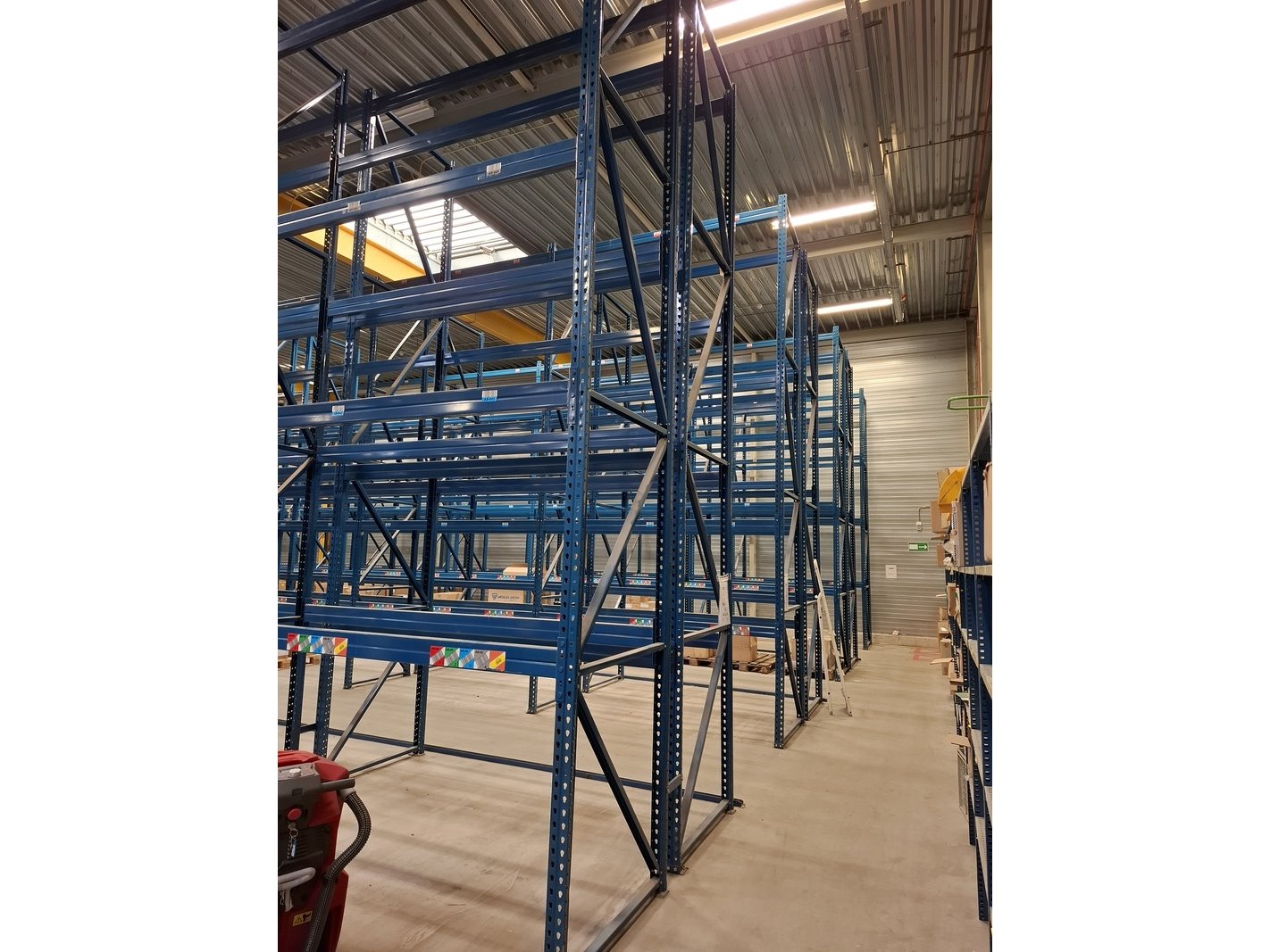 Product: Partij palletstelling met gangpad geleiding Specificaties: bestaande uit: -7 rijen met 11 jukken hxb ca 5,5x1,1mtr -80 liggers, lengte ca 275cm -1 juk, hxb ca 5,5x1,1mtr -6 liggers ca 350cm lengte -incl legbordstelling 12x2,2x0,5mtr -excl inhoud