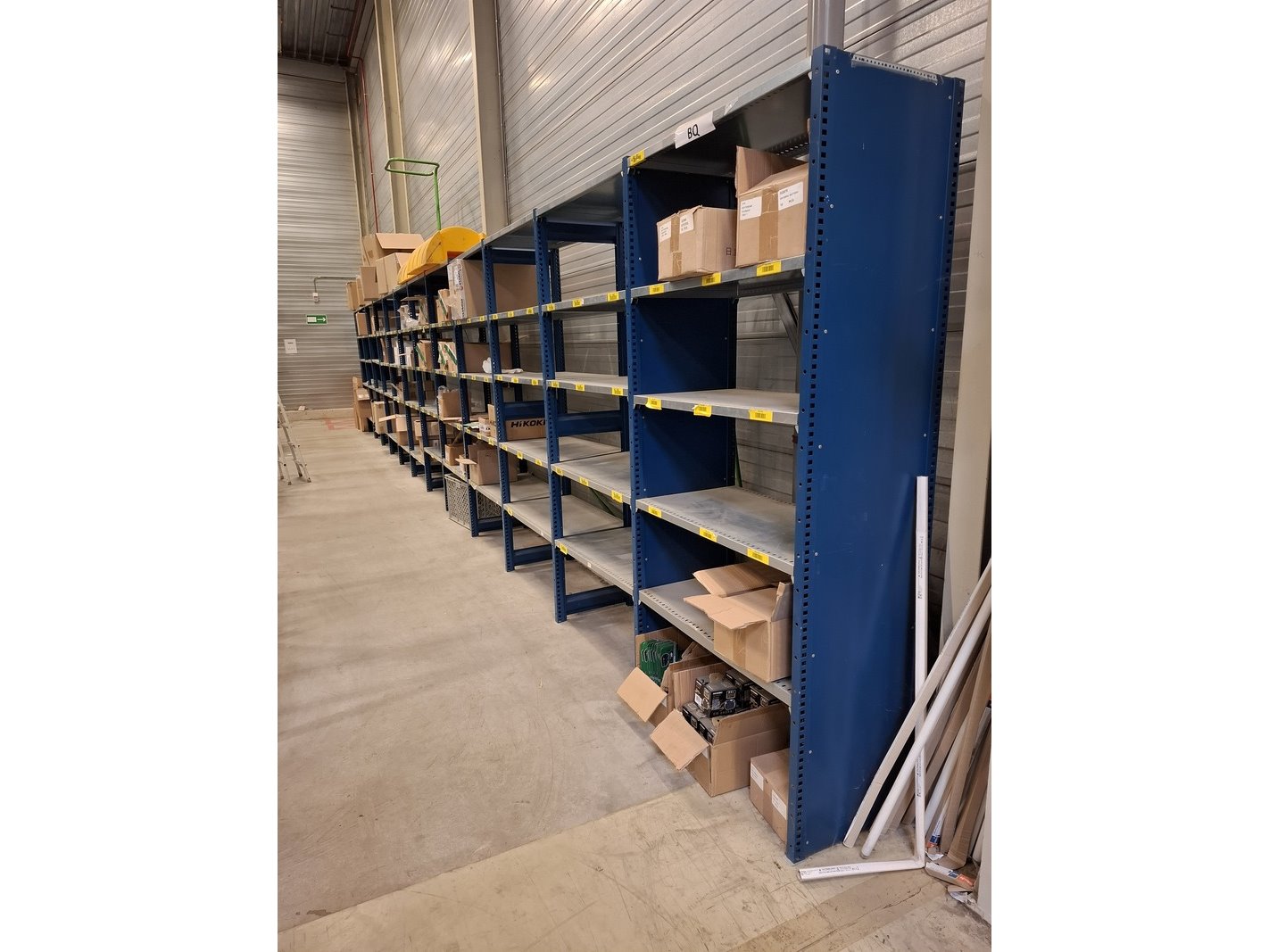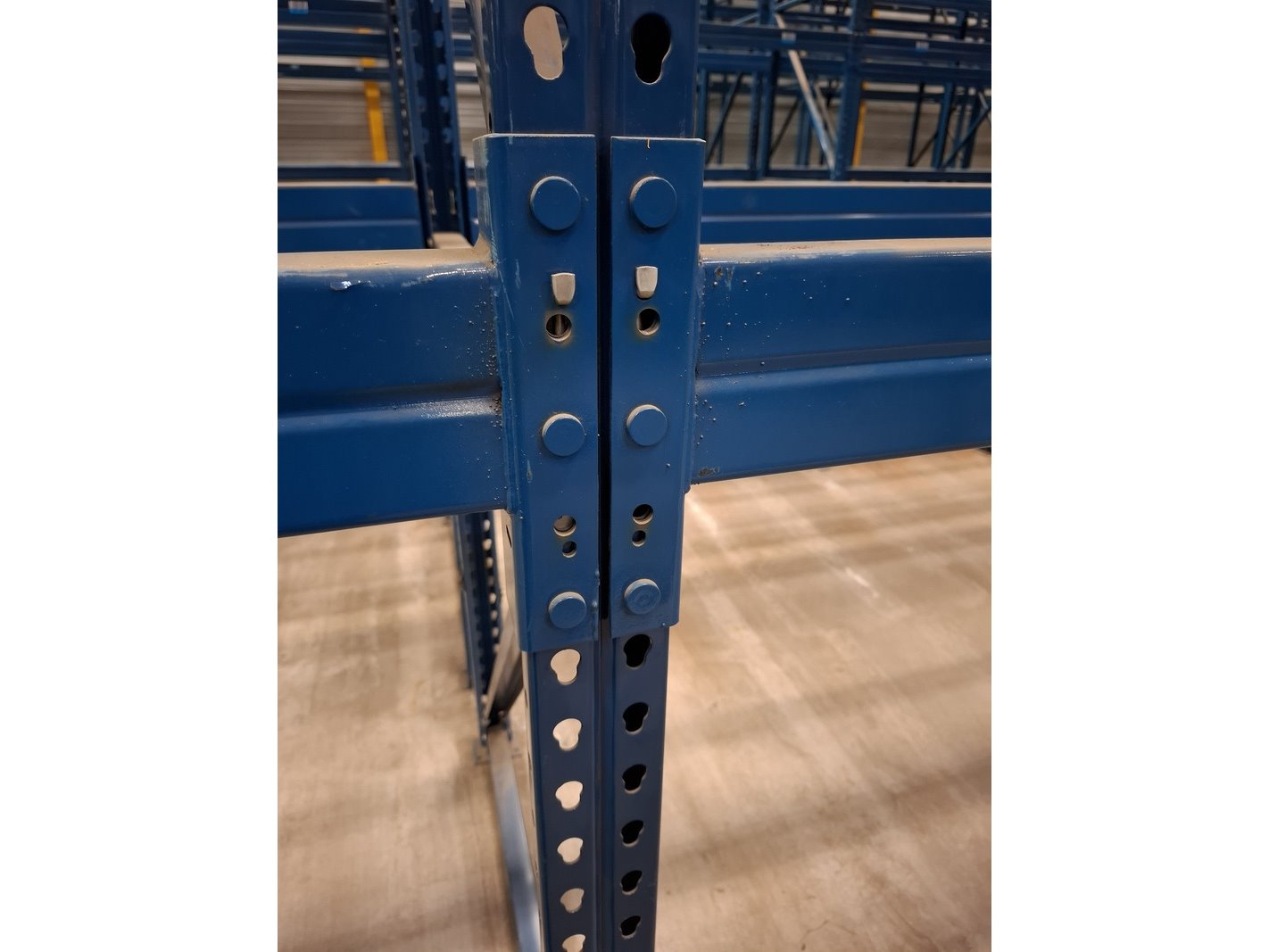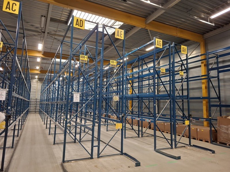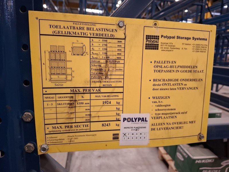 Product: Partij palletstelling met gangpad geleiding Specificaties: bestaande uit: -7 rijen met 11 jukken hxb ca 5,5x1,1mtr -80 liggers, lengte ca 275cm -1 juk, hxb ca 5,5x1,1mtr -6 liggers ca 350cm lengte -incl legbordstelling 12x2,2x0,5mtr -excl inhoud