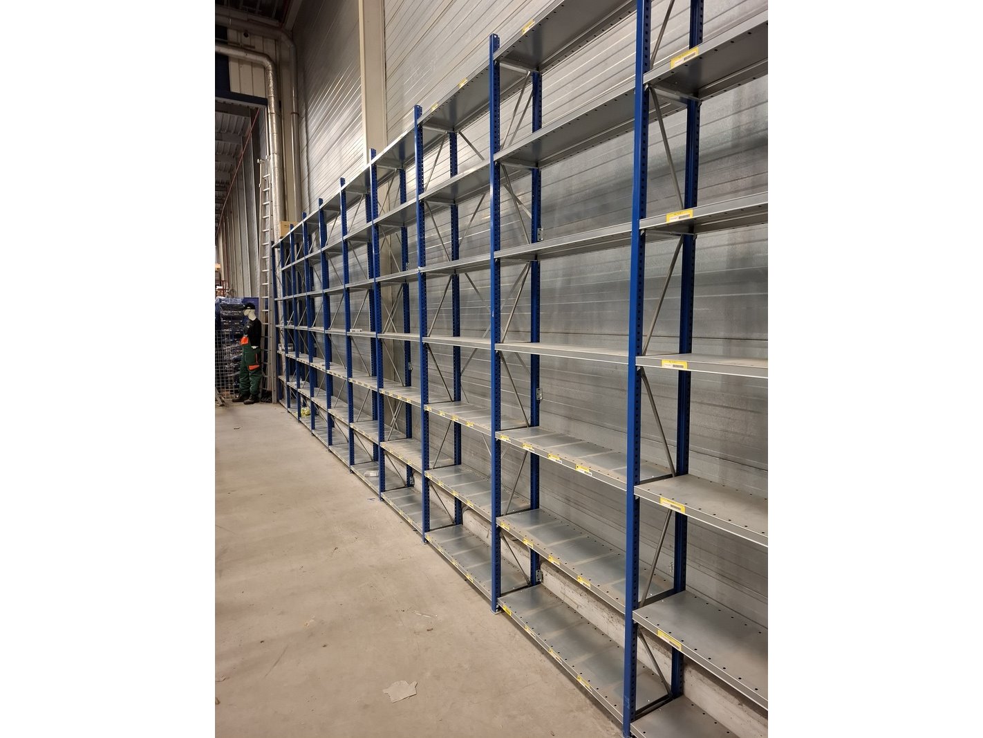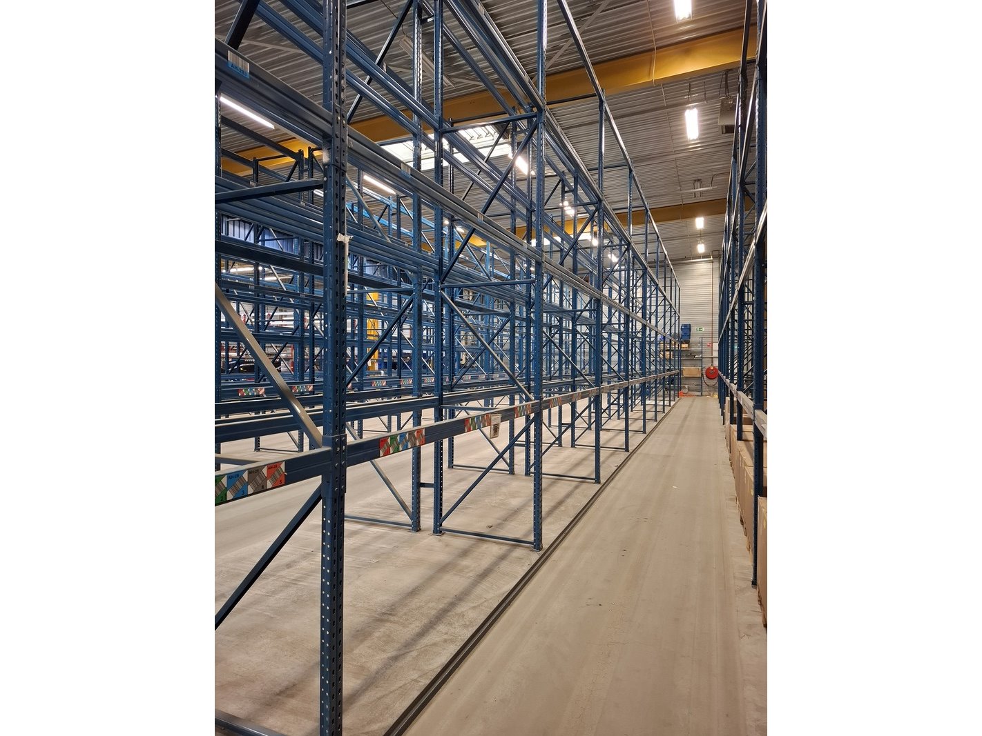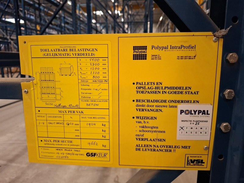 Product: Partij palletstelling Specificaties: bestaande uit: -7 rijen met 11 jukken hxb ca 5,5x1,1mtr -80 liggers, lengte ca 275cm -1 juk hxb ca 5,5x1,1mtr -6 liggers ca 350cm lang -1 rij met 10 jukken van hxb ca 4x1,1mtr 54 liggers, lengte ca 275cm incl legbordstelling afm ca 13x3x0,30mtr