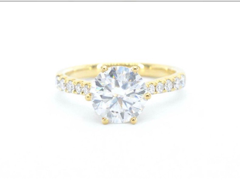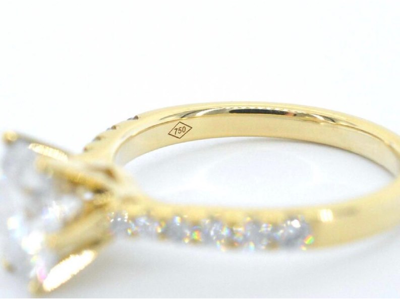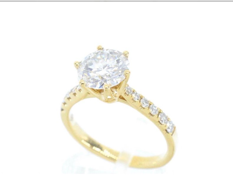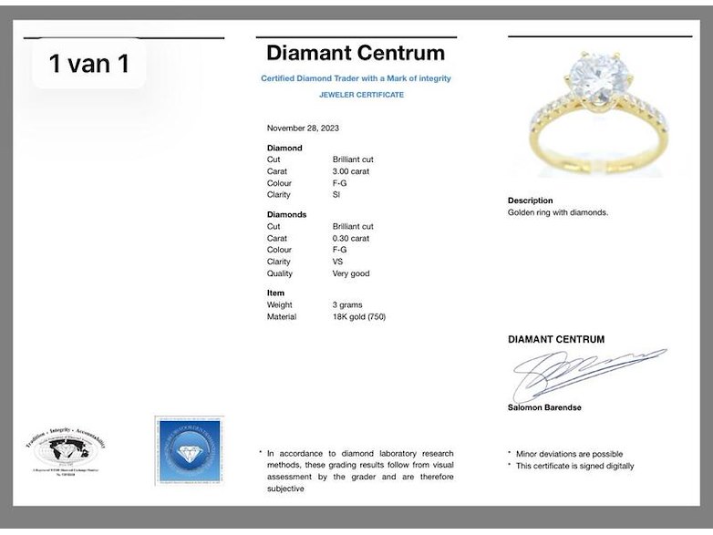 Product: Gouden ring met een briljant geslepen diamant van 3.00 carat Kleur: Goud Materiaal: Goud Afmeting: 53 Conditie: Nieuw Specificaties: Diamant: Natuurlijk Aantal: 1 stuk Slijpvorm: Briljant geslepen Gewicht (carat): 3.00 carat Kleur: F-G Zuiverheid: SI Diamant (secundair): Kleine diamanten Aantal diamanten: 12 stuks Slijpvorm: Briljant geslepen Gewicht (carat): 0.30 carat Kleur: F-G Zuiverheid: VS Slijpkwaliteit: Zeer mooi Juweel: Ring Gewicht: 3 gram Ringmaat (op maat gemaakt*): 53 (17 mm) Materiaal: 18k goud (750) Conditie: Nieuw Verpakking: Luxe sieradendoos Toelichting: De kwaliteit is overgenomen van het rapport behorend bij item. De waardebepaling is een beoordeling van een gecertificeerde diamantair, gebaseerd op consumentenprijzen.