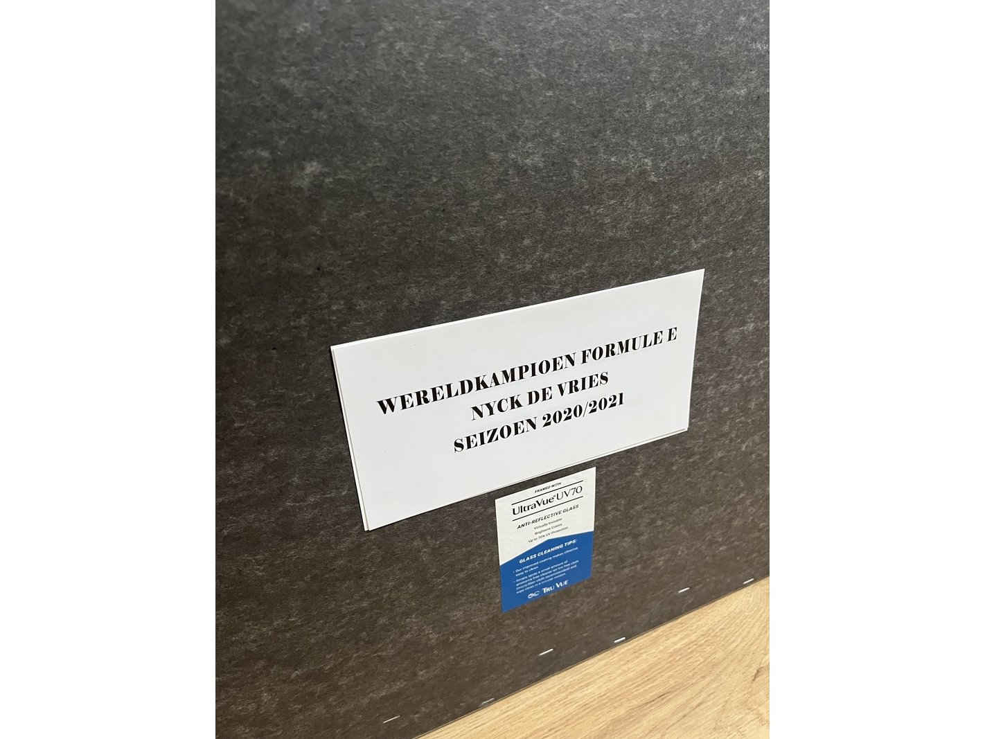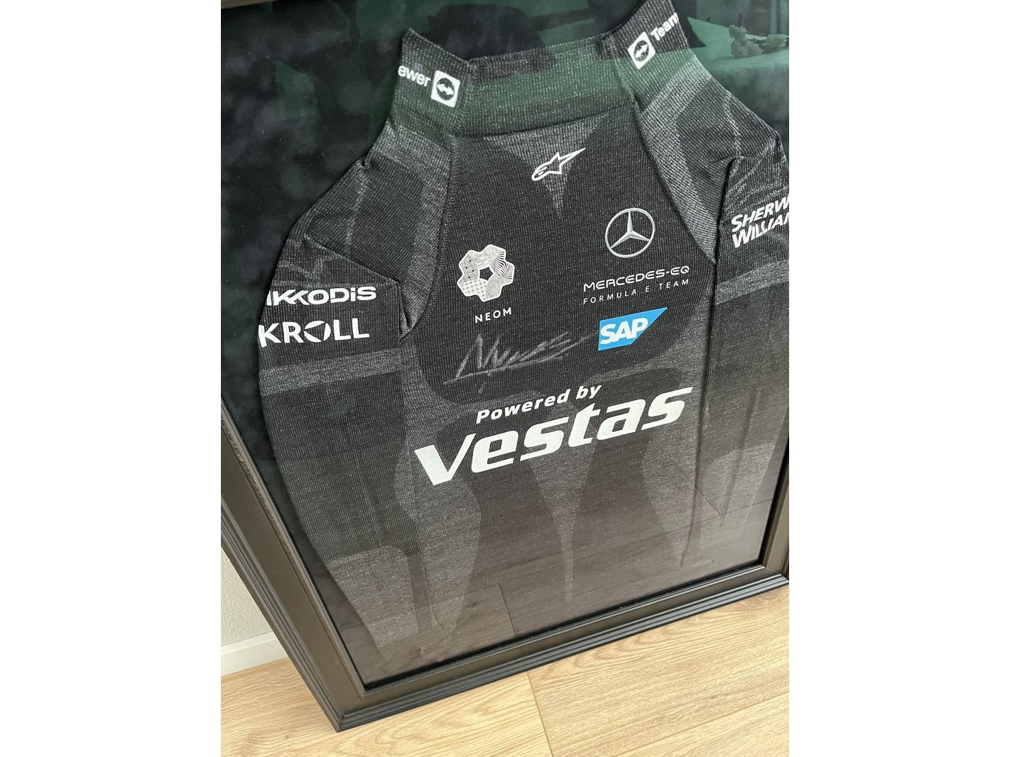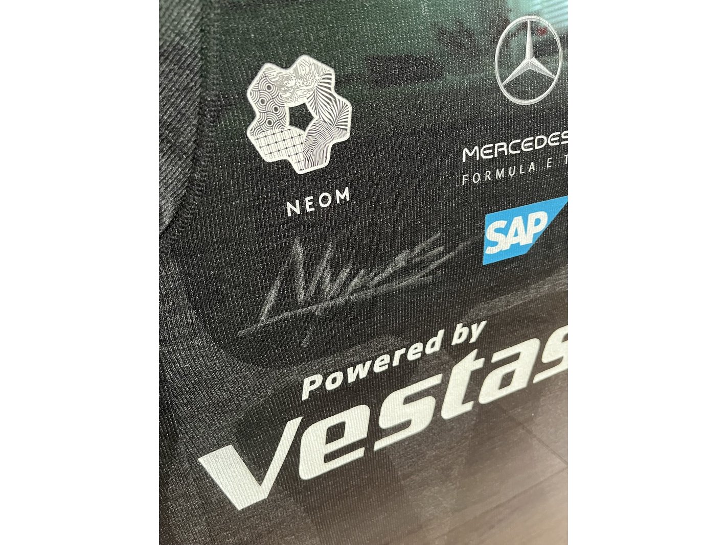 Product: Handgesigneerd Nomex undersuit Nyck de Vries Conditie: Gebruikt Specificaties: Handgesigneerd Nomex undersuit van Nyck de Vries. Afkomstig uit seizoen 2020/2021, het jaar waarmee Nyck kampioen werd in zijn Mercedes in de Formule E. Tussentijds is Nyck testrijder geweest in de Formule 1 voor het team van Mercedes en inmiddels is hij wederom actief in de Formule E. Het shirt is handgesigneerd en geschonken door Nyck zelf aan de toenmalige directie welke de Formule E wilde organiseren in Rotterdam. Helaas heeft dit spektakel nooit plaatsgevonden door het terugtrekken van enkele investeerders.