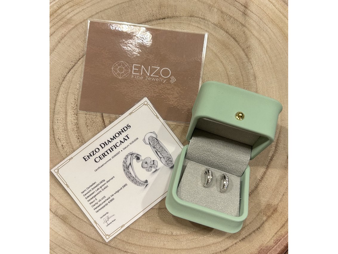 Product: Witgoud Oorbellen met Diamant Conditie: Nieuw Specificaties: Een sierlijk gebogen ontwerp kenmerkt deze elegante diamanten oorringen, ontworpen met een vloeiend en harmonisch silhouet. Een rij briljant geslepen stenen is subtiel aan de voorzijde gezet, waardoor een stralende schittering ontstaat zonder de verfijnde en minimalistische uitstraling te verliezen. Het gepolijste goud versterkt de lichtreflectie en geeft het sieraad een tijdloos en elegant karakter. Perfect voor dagelijks dragen of speciale gelegenheden, bieden deze oorbellen moeiteloze elegantie met een moderne en vrouwelijke uitstraling. Lab-grown Diamond report: Aantal: 30 stuks Slijpvorm: Round Gewicht (carat total): 0,4ct Kleur: E Zuiverheid: VVS Polish: Excellent Symmetry: Excellent Fluoresence: None Certificaat: Sieraden certificaat Conditie: Nieuw Gewicht Goud: 3,983g Metaalzuiverheid: 14k witgoud (585) Verpakking: Komt met een Edelsteendoos, sieraden rapport