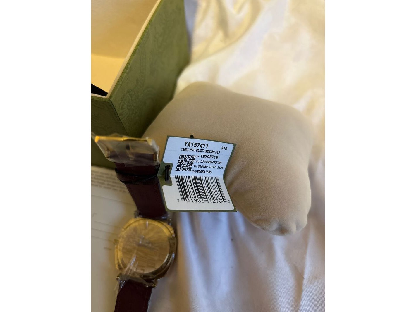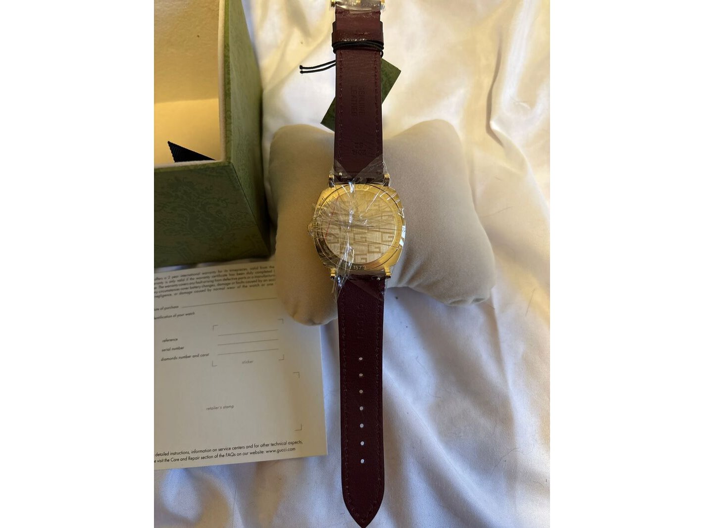 Merk: Gucci Product: Horloge Materiaal: Origineel leren bandje, rvs kast Afmeting: 38 mm Conditie: Nieuw Specificaties: Gucci grip horloge YA157411 nieuw in doos met tags Origineel leren bandje Roestvrijstalen kast 38 MM