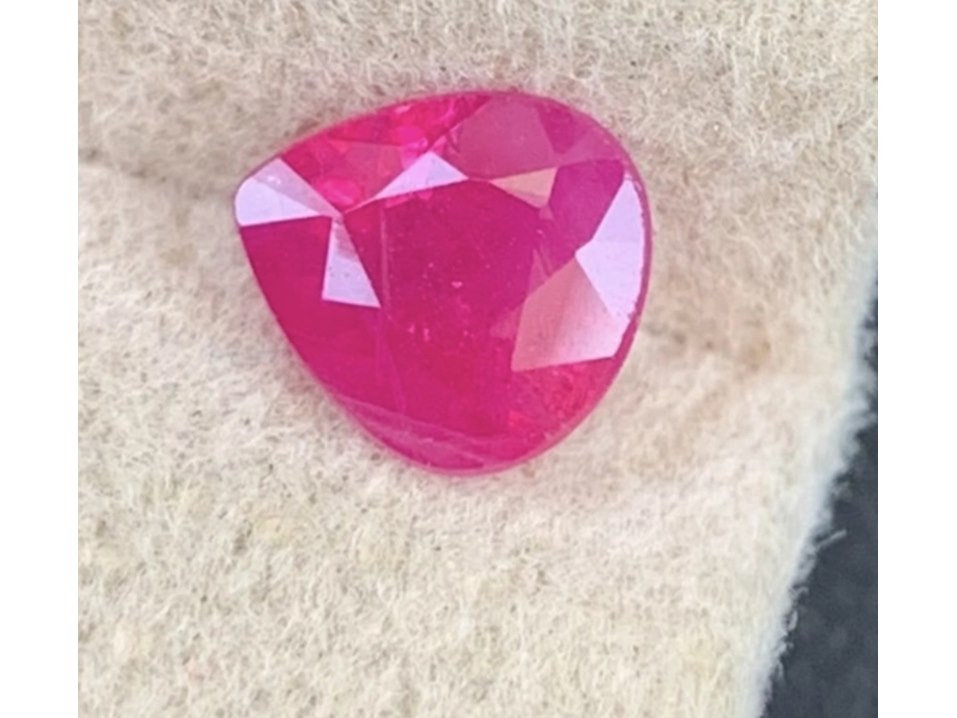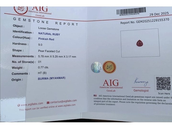 Product: Natuurlijke Robijn - Burma (Myanmar) | 0.77ct Kleur: Rood Conditie: Nieuw Specificaties: Natuurlijke Robijn – Burma (Myanmar). Mooie natuurlijke robijn van 0.77 karaat met een elegante peervormige slijping, afkomstig uit Burma (Myanmar) – een van de bekendste herkomsten voor robijnen ter wereld. Details van de Edelsteen: Edelsteen: Natuurlijke Robijn Gewicht: 0.77 Karaat Afmetingen: 5.78 × 5.29 × 3.17 mm Vorm: Peer (Pear Shape) Slijpvorm: Gefacetteerd Behandeling: Hittebehandeld (gebruikelijk en geaccepteerd in de edelsteenhandel) Herkomst: Burma (Myanmar) Rapport: AIG Gemologisch Laboratorium Rapport: Deze robijn wordt geleverd met een officieel AIG-rapport